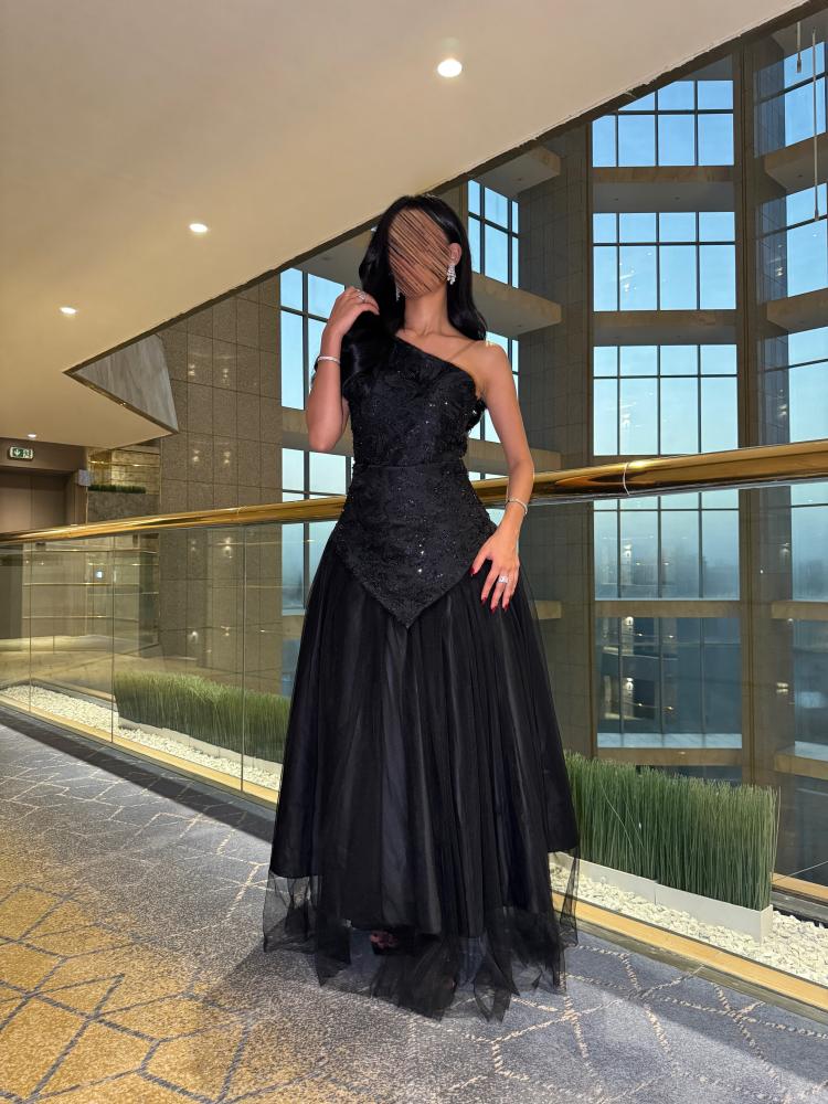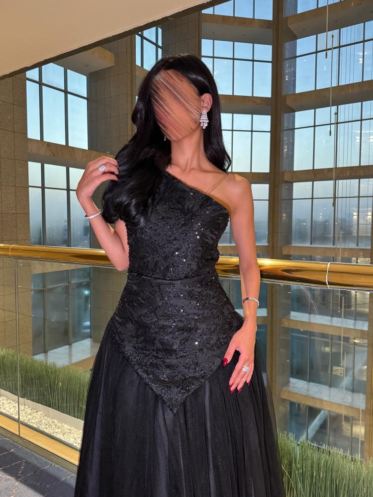 فستان سهرة أسود فاخر بتصميم كتف واحد (One Shoulder) يجمع بين الأناقة الكلاسيكية والجاذبية العصرية.