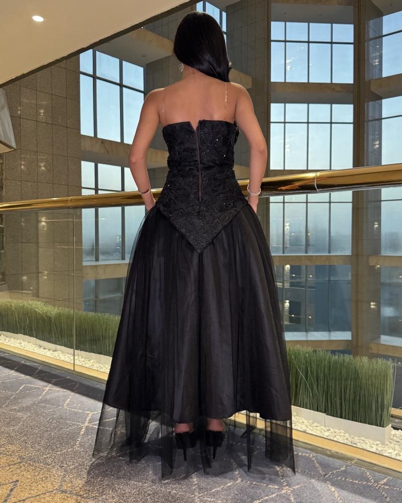 - القماش والتفاصيل: الجزء العلوي مطرز بخيوط لامعة تضيف لمسة فخمة راقية، بينما الجزء السفلي مصنوع من تول ناعم منسدل يمنح الفستان خفة وأناقة ملكية.