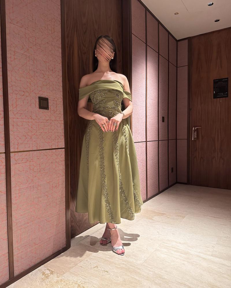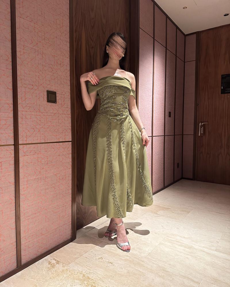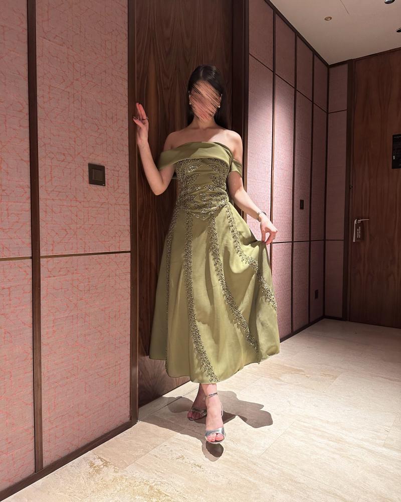 - الجزء العلوي: أوف شولدر (Off-Shoulder) مع طيّة أنيقة على الأكتاف تعطي مظهراً أنثوياً جذاباً.