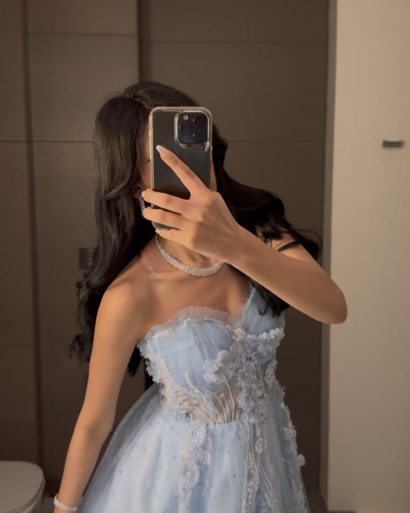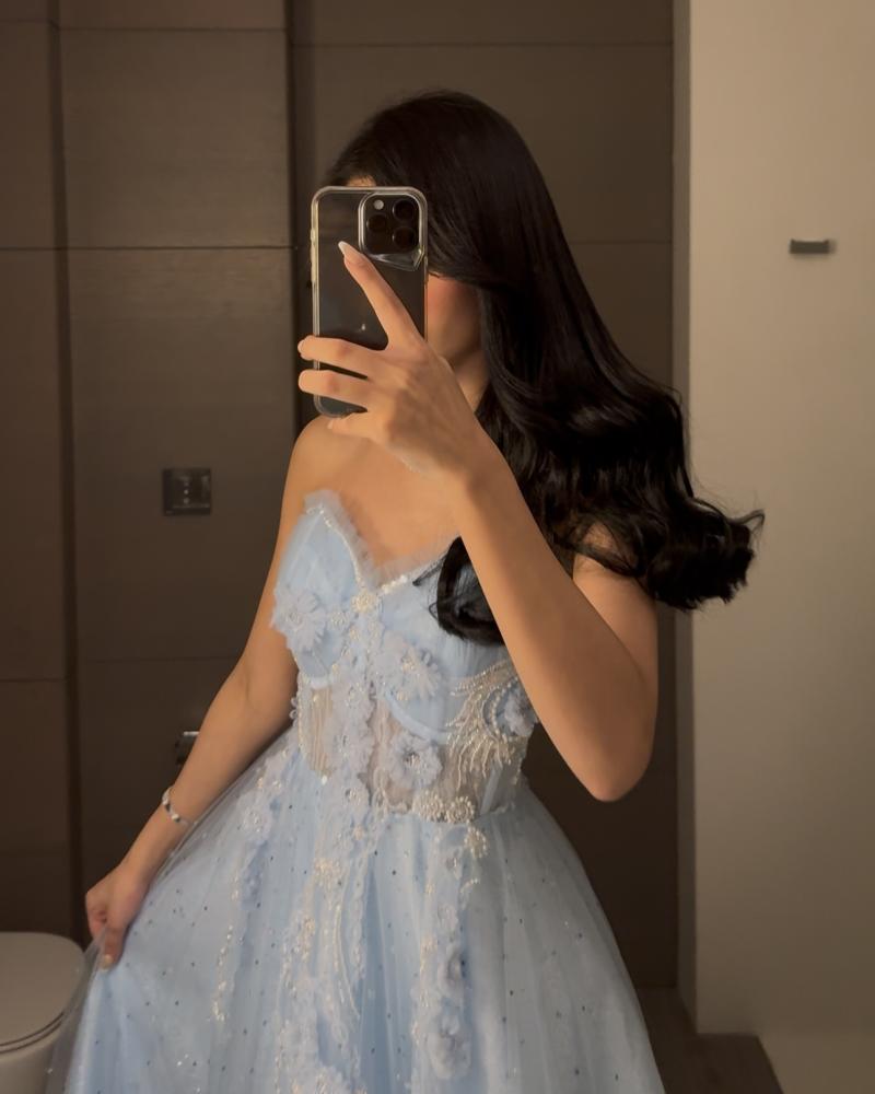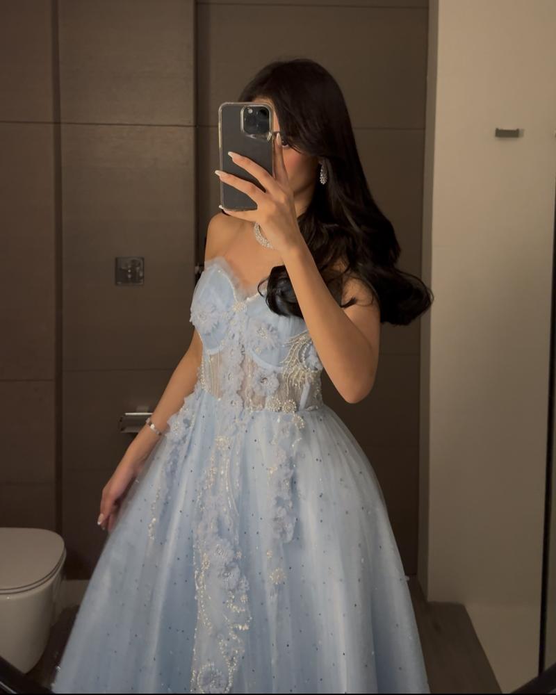 الفستان أنيق وفخم بطابع ملكي يتميز بلونه الهادئ السماوي، مع تطريزات بارزة باللون الأبيض على شكل ورود ونقوش أنثوية راقية تمتد من الصدر حتى أسفل الفستان.