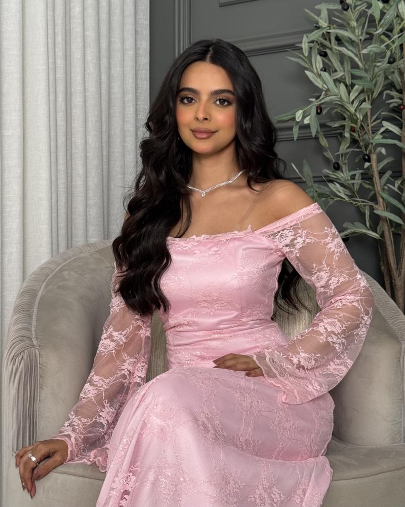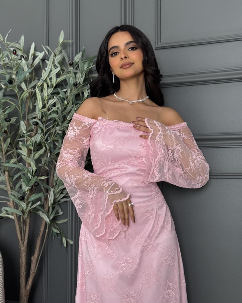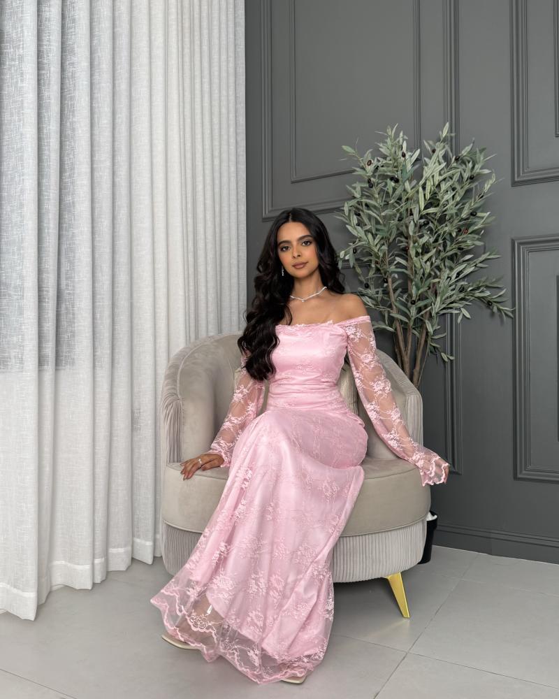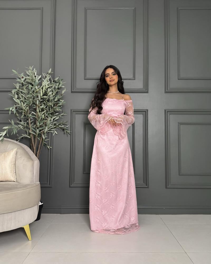 التفاصيل الإضافية: الفستان يتميز بتصميم أنثوي ناعم ولون وردي هادئ يضفي عليه لمسة رومانسية. القماش مصنوع من الدانتيل المزين بنقوش زهرية أنيقة تغطي الفستان بالكامل، مما يمنحه طابعًا راقيًا ومميزًا