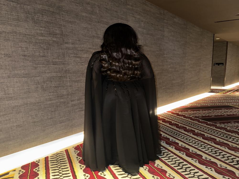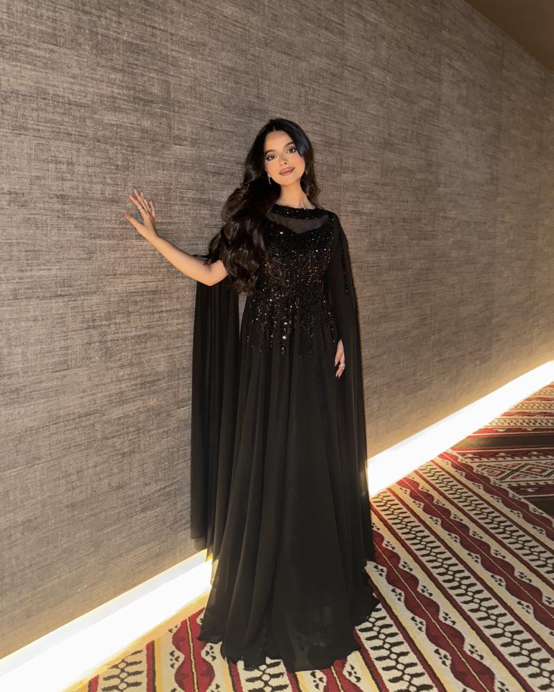 • الأكمام على شكل كاب (Cape) طويل وشفاف ينسدل من الكتفين حتى الأرض، مما يعزز الإحساس بالفخامة والهيبة.