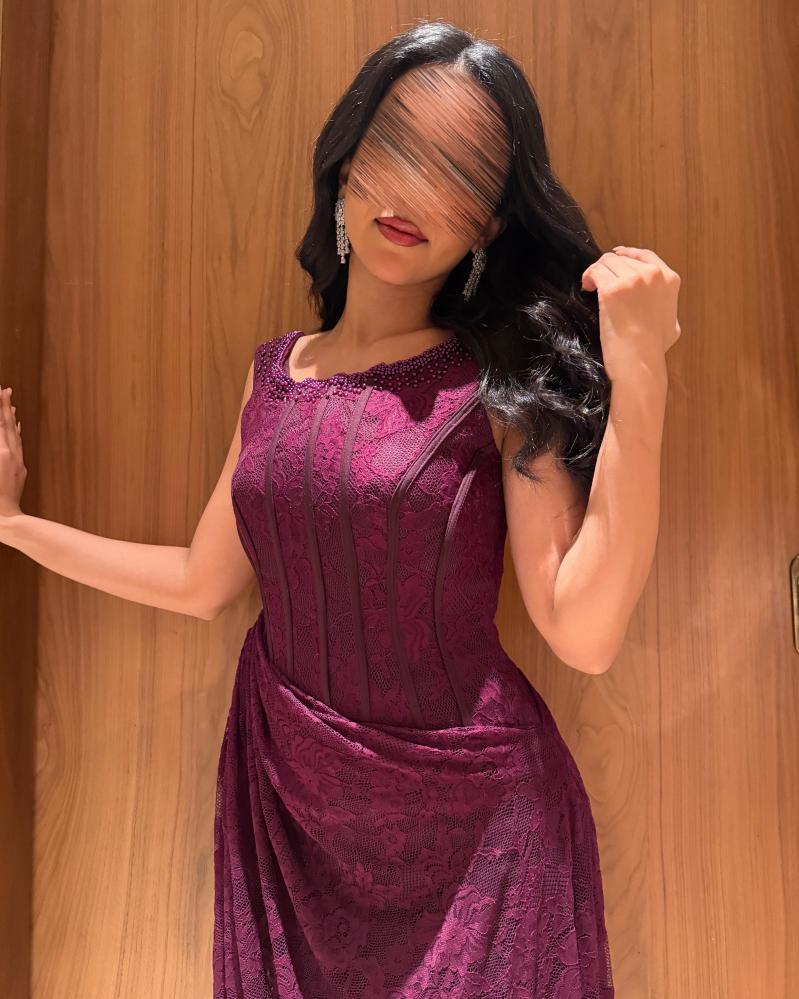 - التنورة: طويلة تنسدل حتى الأرض، بتصميم ملتف قليلاً وطبقات خفيفة تعزز الإطلالة الفاخرة.