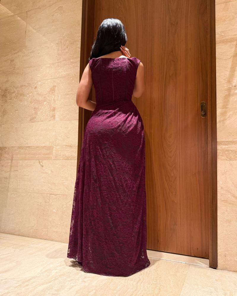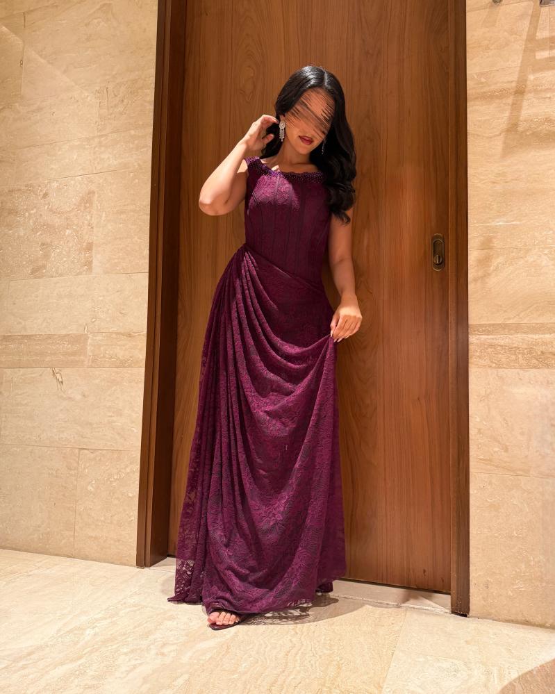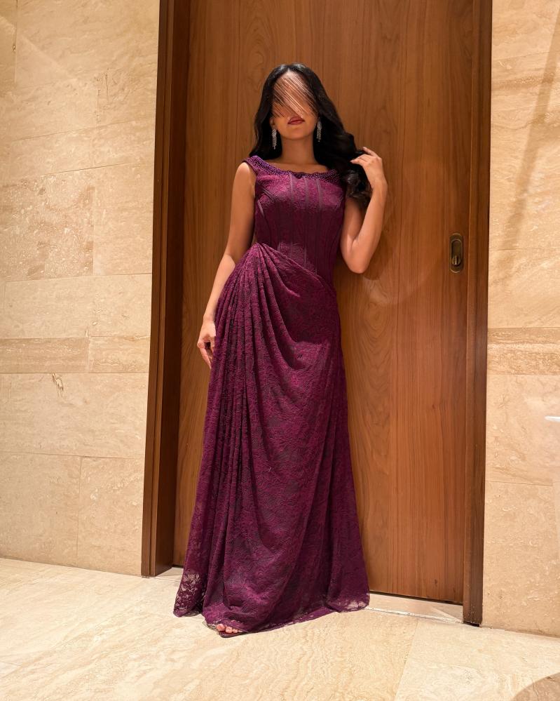 - الخصر: مشدود ومحدد بدقة، مع طبقات قماش منسدلة من الجانب تُشكل تموجات أنيقة تمنح الفستان حركة وانسيابية.
