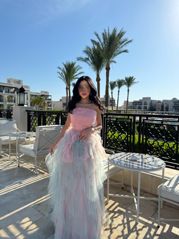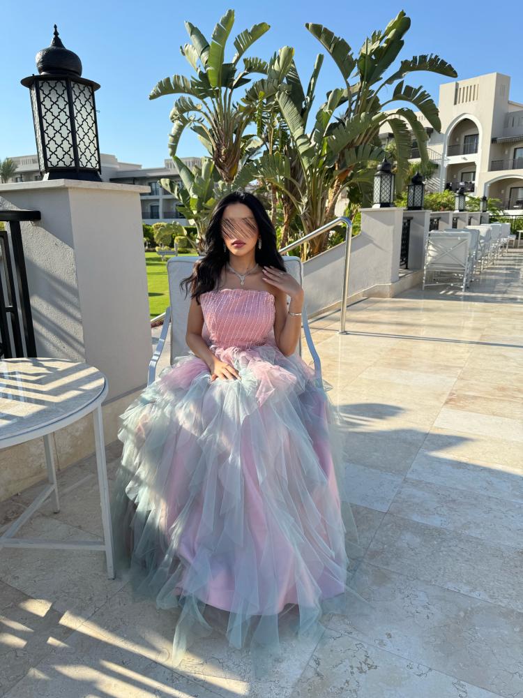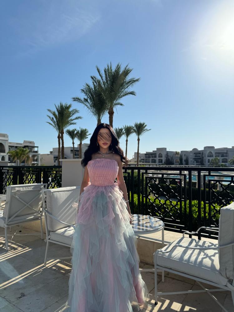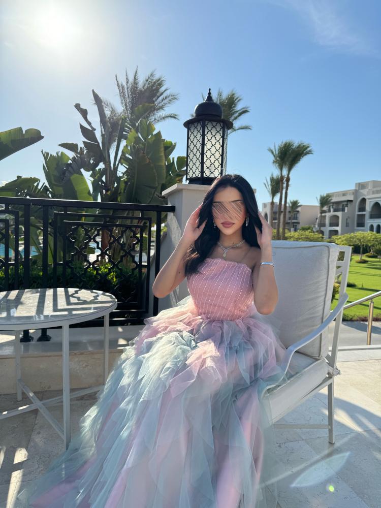 مواصفات الفستان:نوع الفستان : ناعم.نوع القماش : شيفون لونين .طريقة التفصيل : كراكش الشيفون وتطيرز الفصوص على الصدر . التفاصيل الإضافية: كرنشة لونين والفصوص الامعه بالصدر .