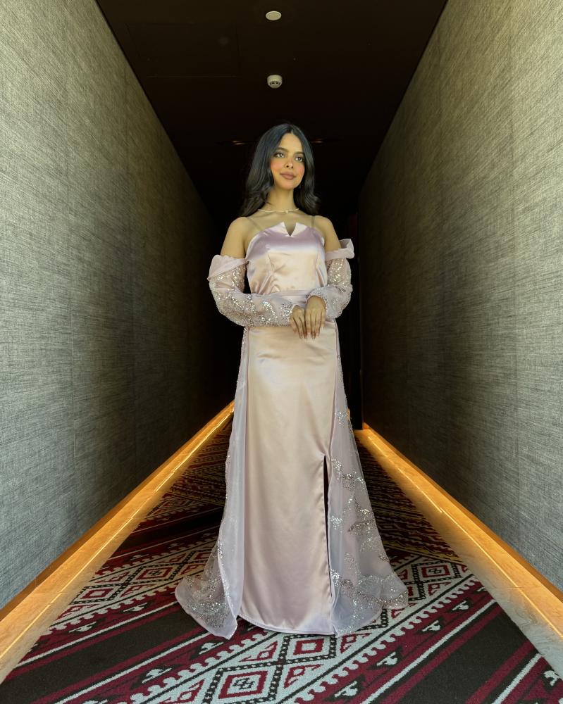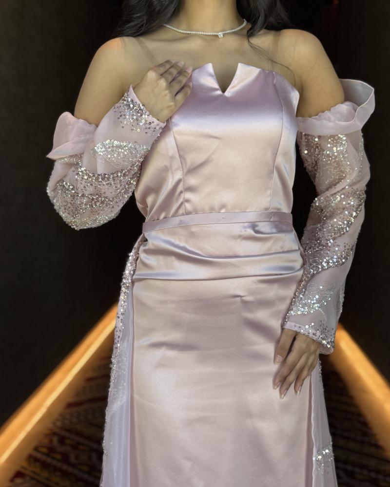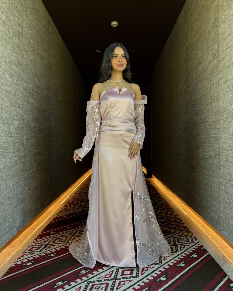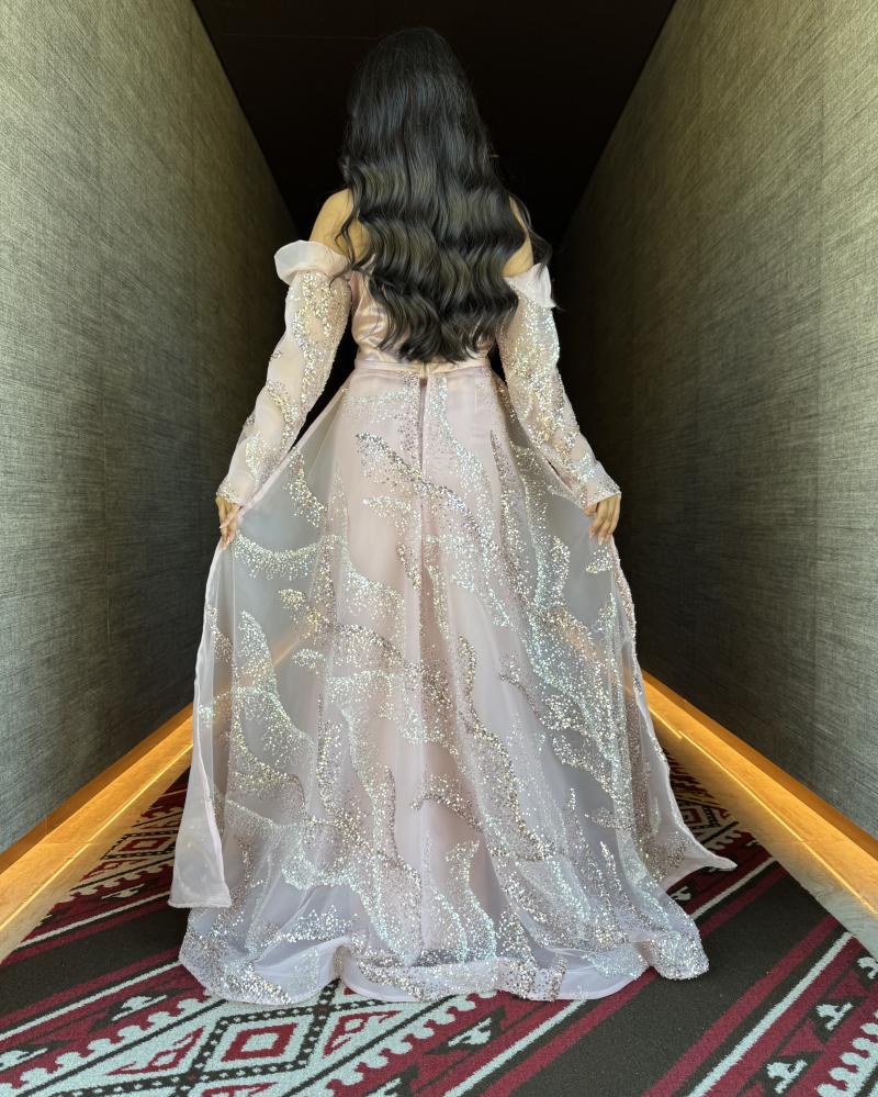 • الأكمام: منسدلة عن الأكتاف (أوف شولدر)، وشفافة بالكامل، مزينة بنفس تطريز الترتر اللامع الموجود على التنورة الخارجية.