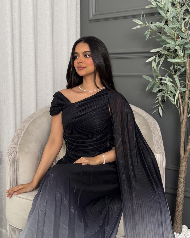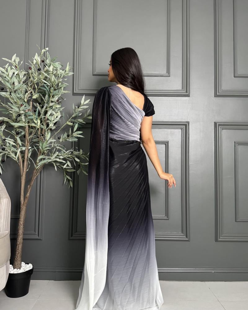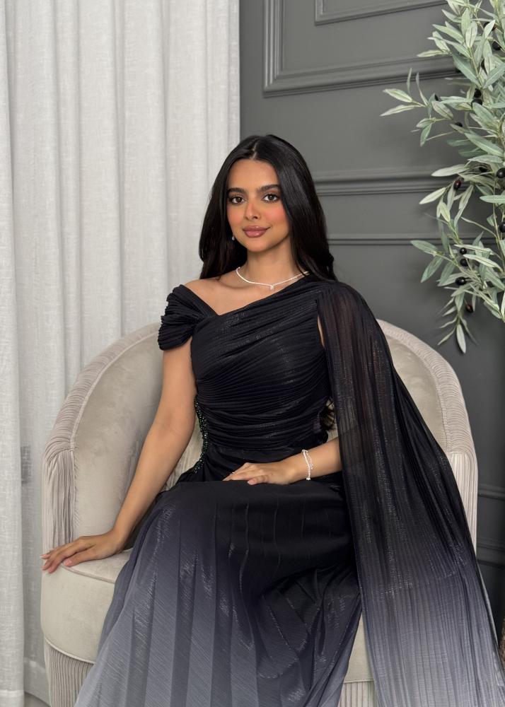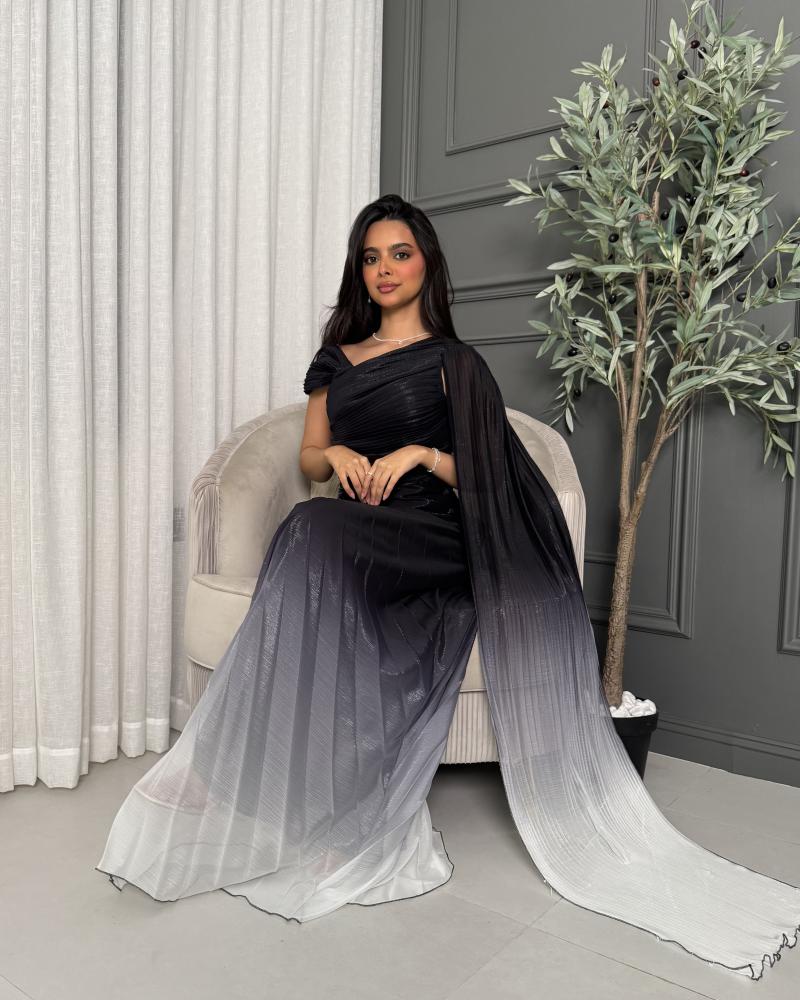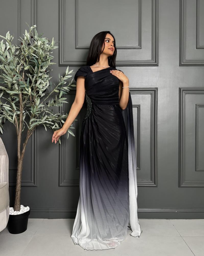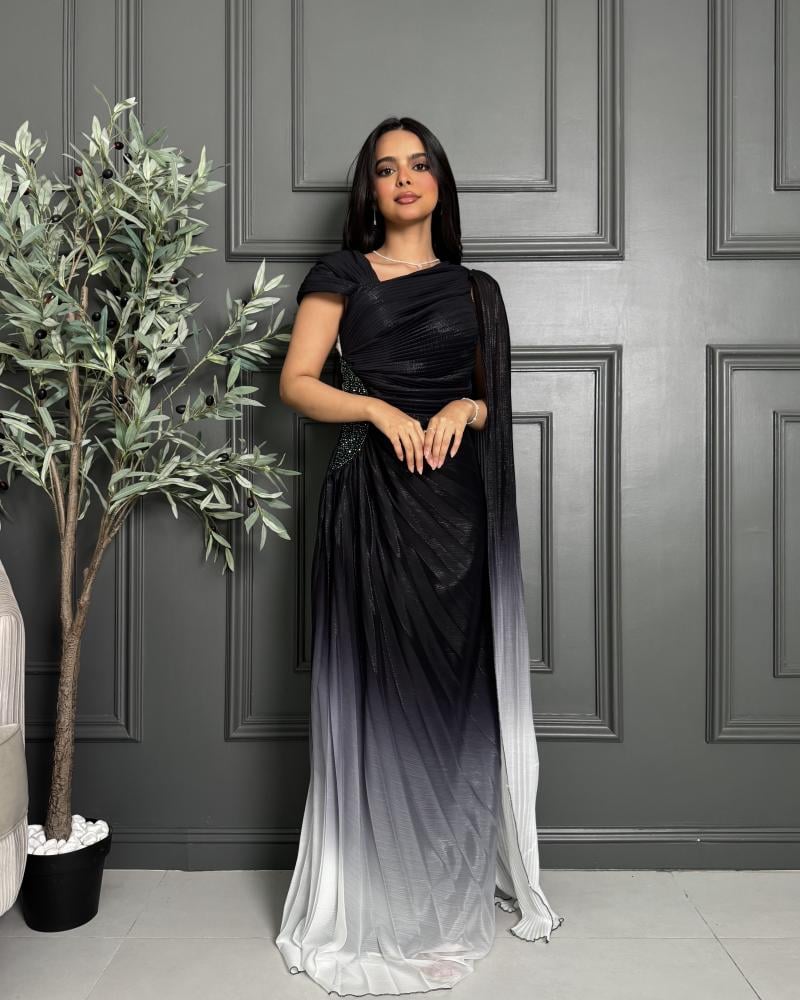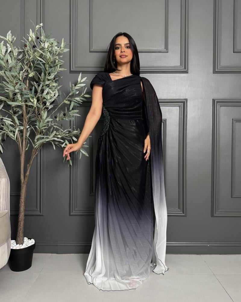 • طريقة التفصيل : يتميز الفستان بلونه المتدرج من الأسود في الأعلى إلى الأبيض في الأسفل، مما يمنحه تأثير الـ ombre الجذاب.