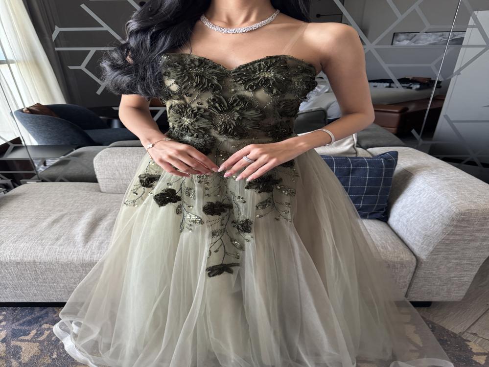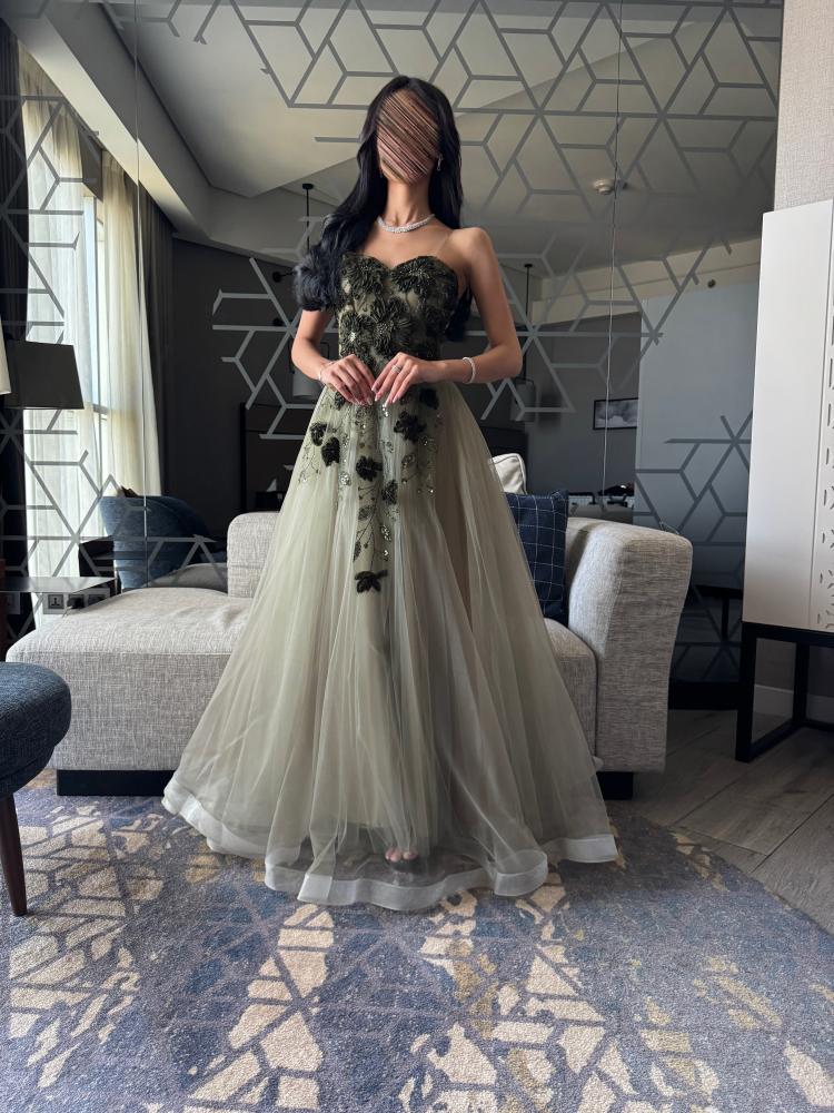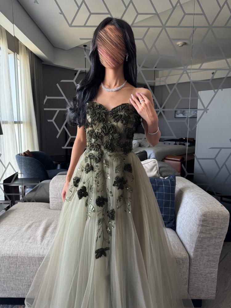 - الجزء السفلي: مصنوع من طبقات من التول الشفاف الناعم، باللون البيج المائل للرمادي، ويتسع تدريجيًا ليأخذ شكل تنورة فلوية منسدلة تضيف إحساسًا بالحركة والنعومة.