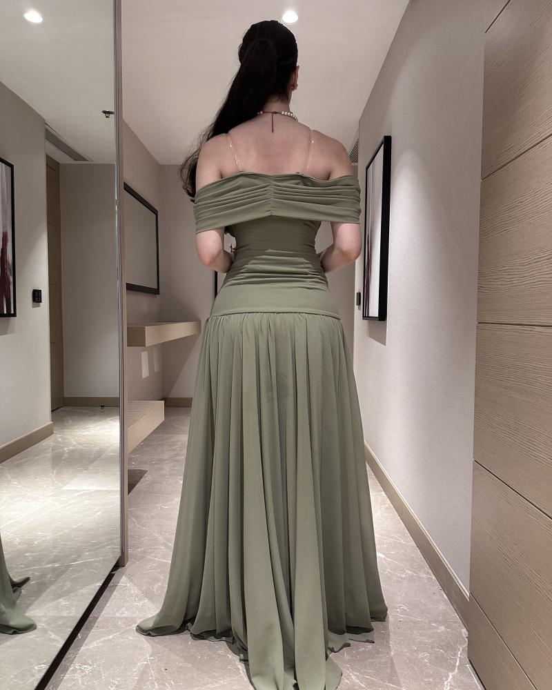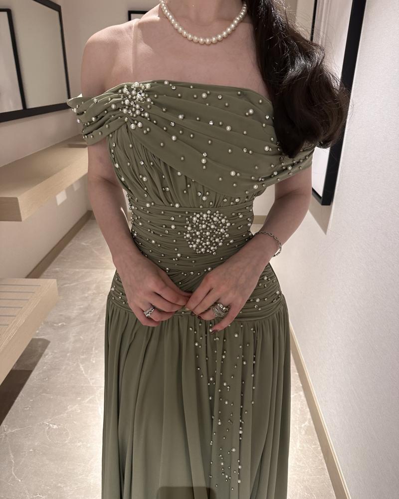 الفستان بلون زيتي فاتح مائل إلى الرمادي، مصنوع من قماش شيفون حريري يمنحه خفّة وانسيابية رائعة. الجزء العلوي بتصميم أوف شولدر (off-shoulder) مع تطريز لؤلؤي وخرز فضي صغير متناثر بشكل متناغم، يضيف لمسة من اللمعان والرقي.