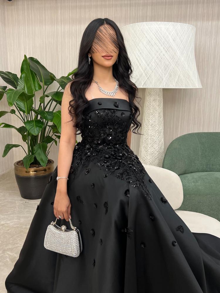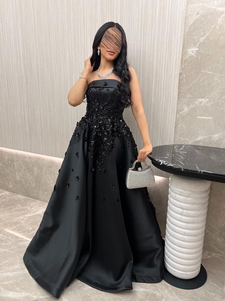 مواصفات الفستان:نوع الفستان : سهرة .نوع القماش : توب مياكدو .طريقة التفصيل : تل مطرز اسود طويل . التفاصيل الإضافية: فستان سهره انيق .