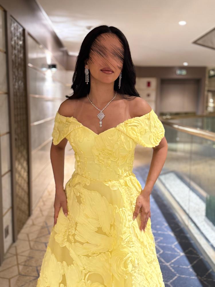 • اللون: اصفر يمنح الفستان طابعاً ملكياً وفخامة.