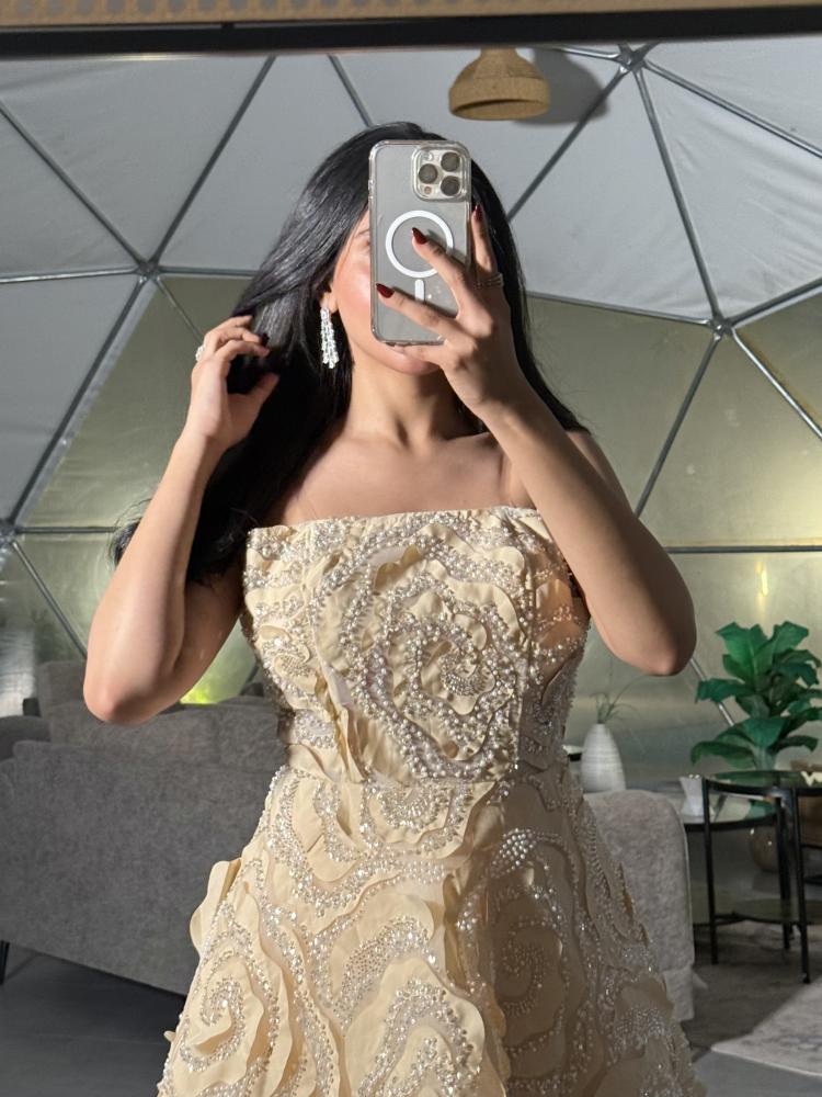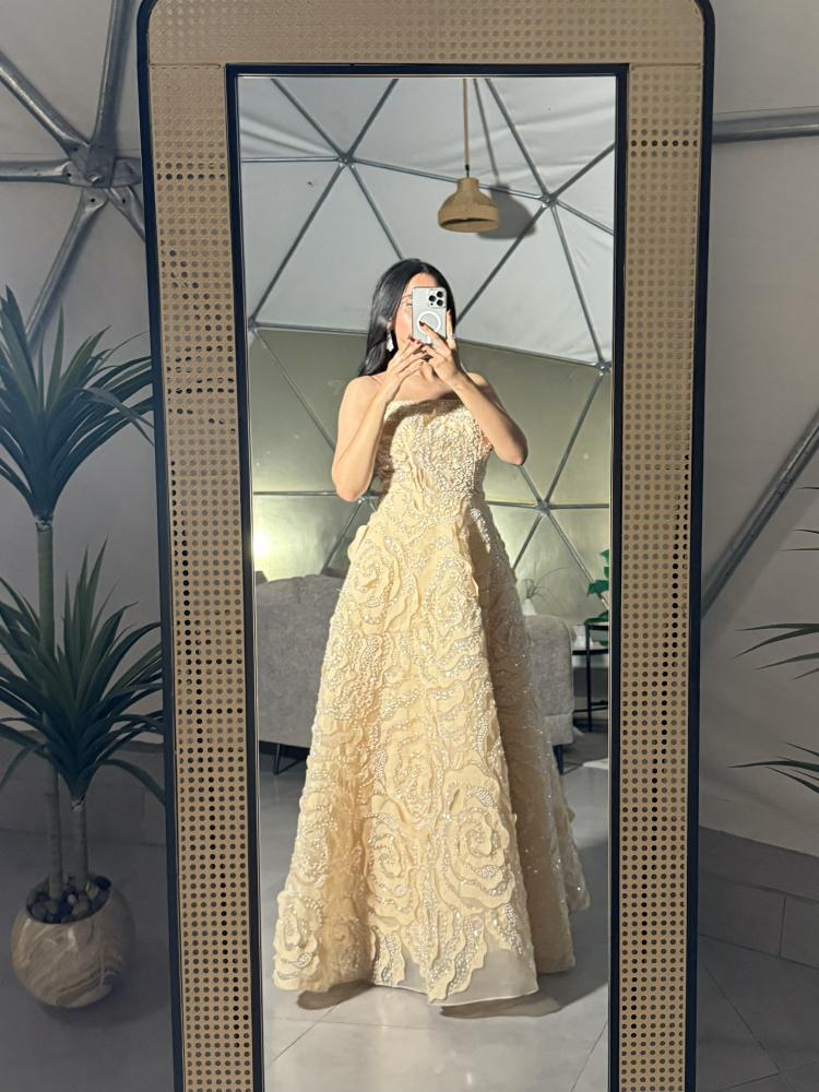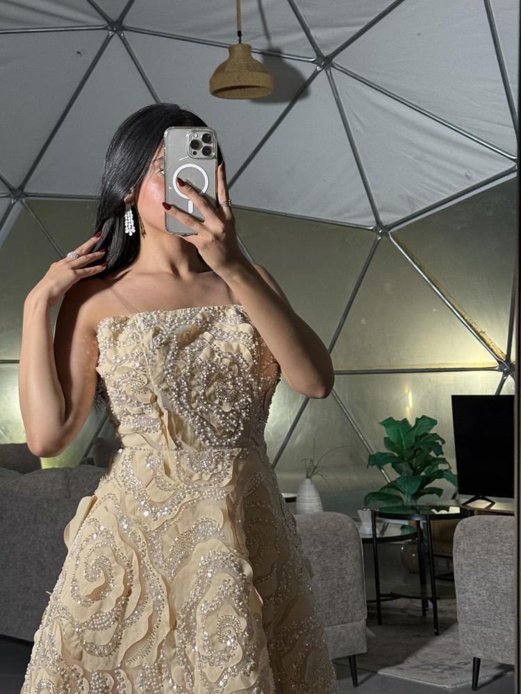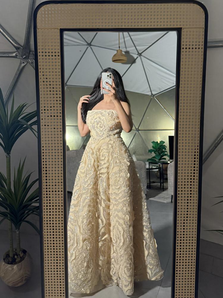 - التفاصيل الإضافية: الفستان يتميز بتصميم أنيق وفخم. لونه بيج مائل إلى الذهبي، وهو مزين بتطريزات دقيقة ولامعة تغطي كامل الفستان بنقوش أنثوية تضيف لمسة راقية. التصميم بدون أكمام (ستربلس) مع قصّة ضيقة عند الخصر تتسع تدريجياً للأسفل، مما يعطي مظهراً كلاسيكياً يشبه فساتين السهرة الملكية. القماش يبدو مزيجاً من الدانتيل والتول المطرز، ما يعكس الإضاءة بشكل جميل. .