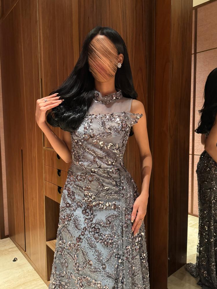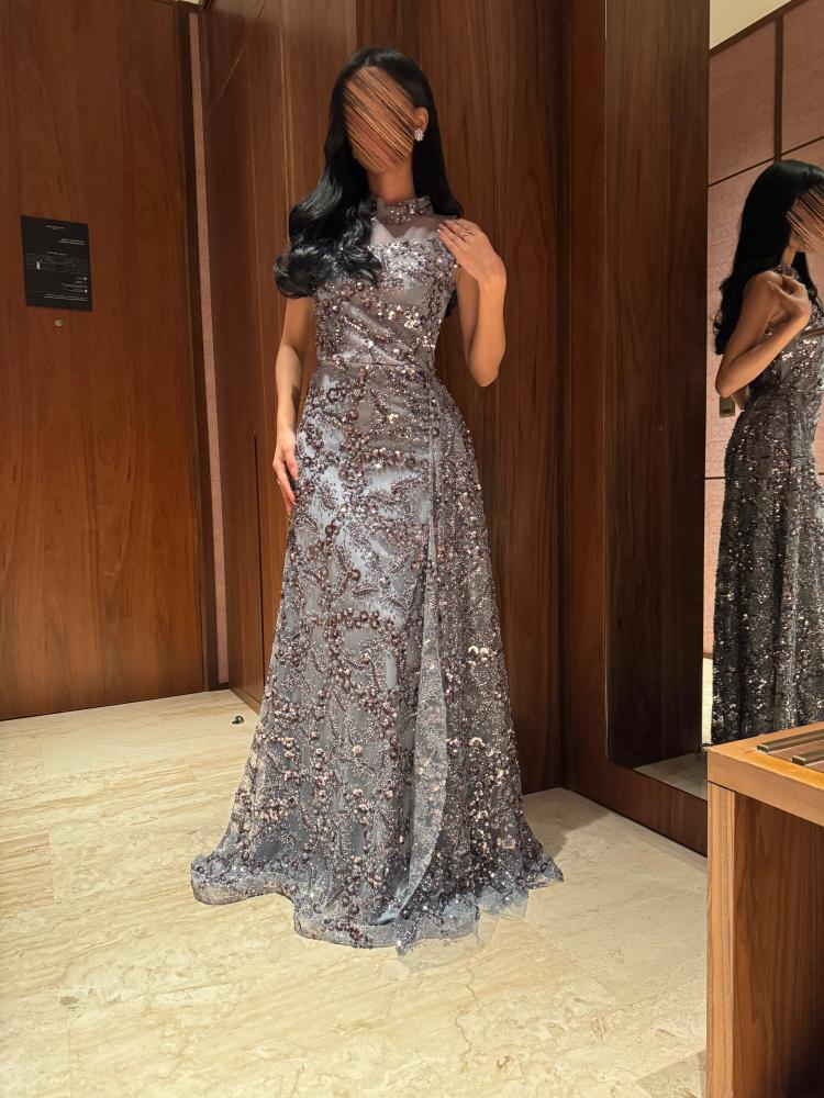 - القماش: شفاف من التول أو الشيفون المغطى بالكامل بتطريزات دقيقة من الخرز والترتر الفضي، ما يمنحه لمعانًا وأناقة.