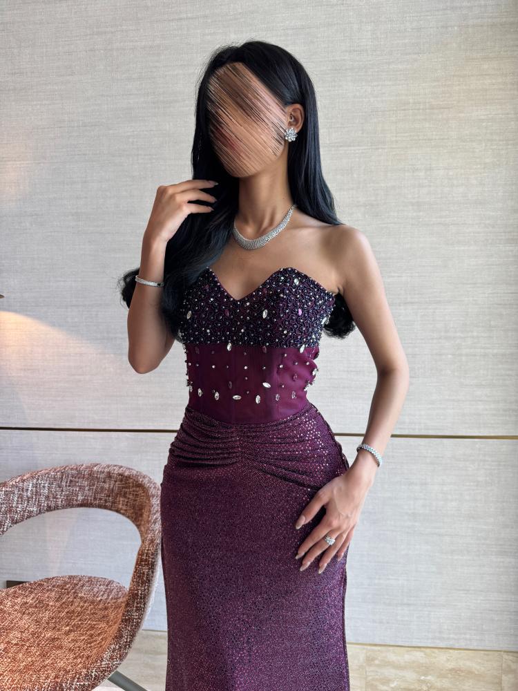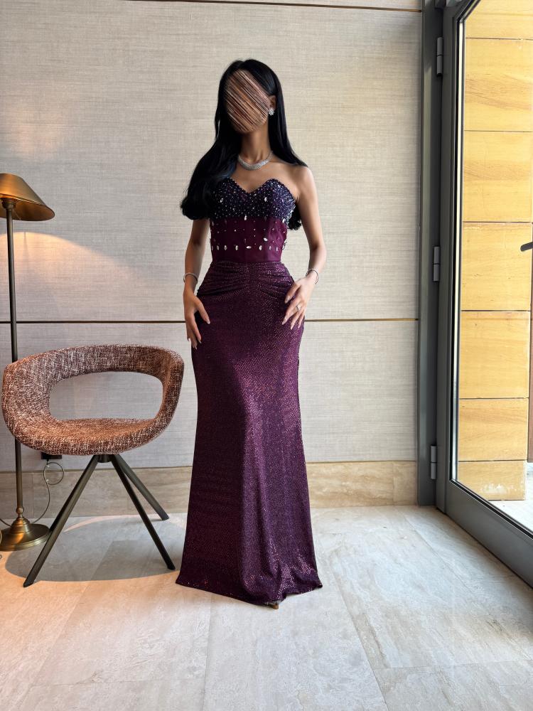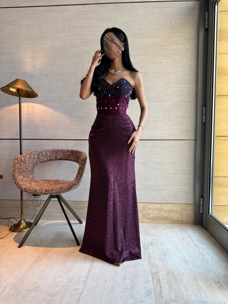 - الجزء العلوي: مطرّز بترتر وكريستالات لامعة باللون الداكن، مع حبات صغيرة موزّعة بشكل أنيق، مما يضيف بريقاً جذاباً.