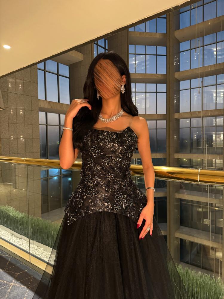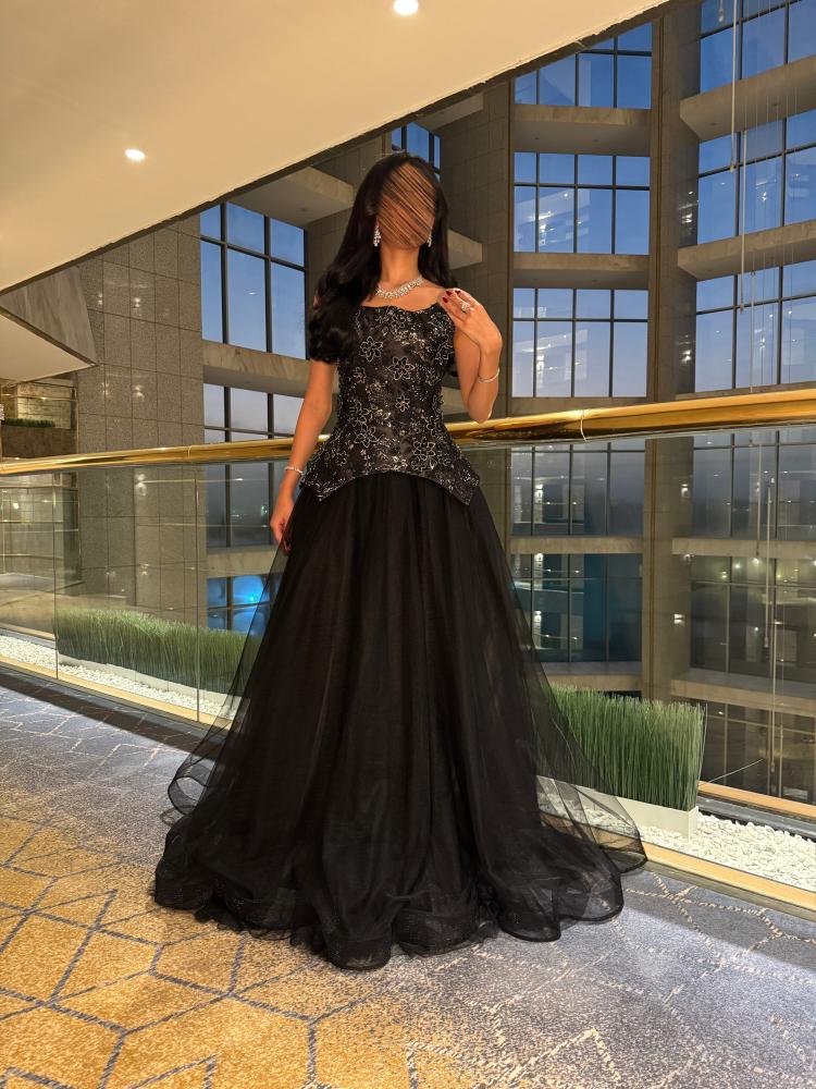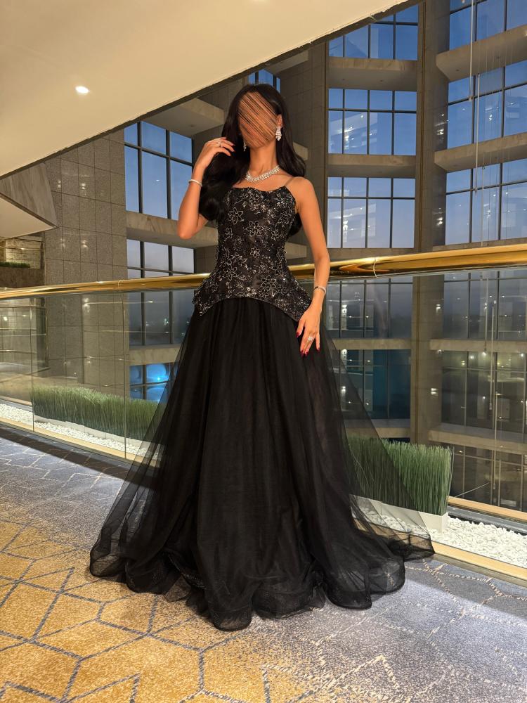 التفاصيل الإضافية الفستان بلون اسود مائل إلى الفضي يمنحه مظهرًا راقيًا وفخمًا. الجزء العلوي مصنوع من قماش التل مزخرف بالتطريز الفضي الفاتح مع لمسات لامعة خفيفة تضيف بريقًا ناعمً