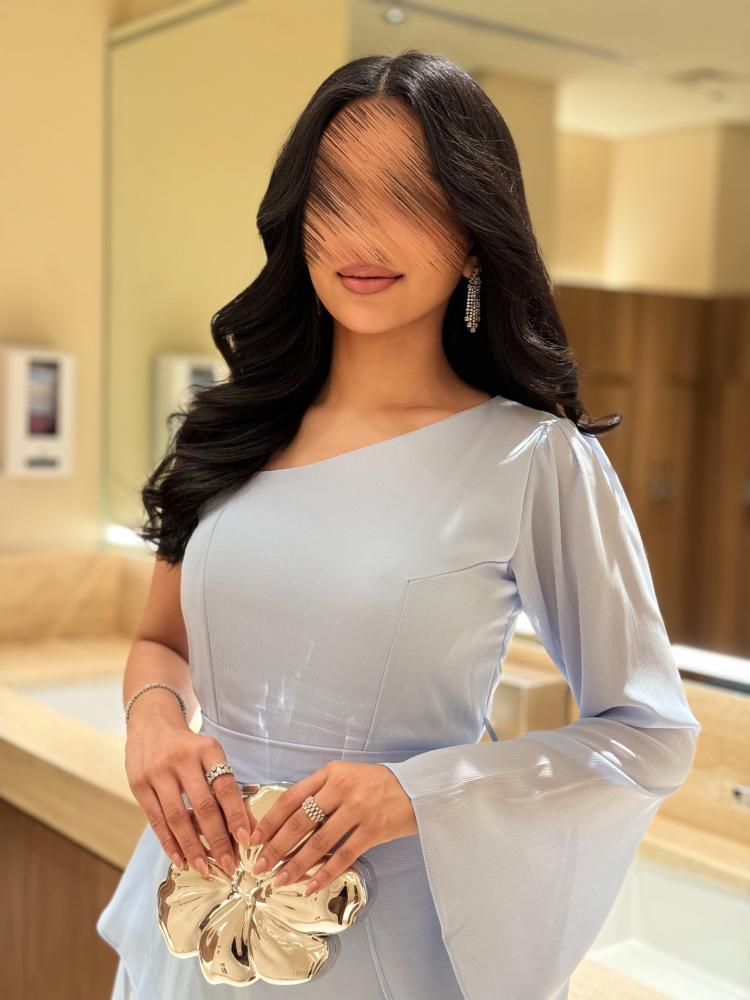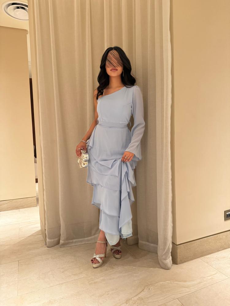 طريقة التفصيل : الفستان يتميز بتصميم أنيق وعصري باللون الأزرق السماوي الفاتح. يحتوي على كتف واحد مكشوف بتصميم أنيق مع كم طويل على الجانب الآخر قصة طبقات متدرجة بأسلوب غير متماثل، مما يضفي حركة وشكلاً أنثوياً جميلاً حزام ناعم يحدد الخصر ليبرز القوام الخامة تبدو خفيفة وشيفون، مما يجعلها ملائمة للأجواء المسائية أو المناسبات الخاصة .