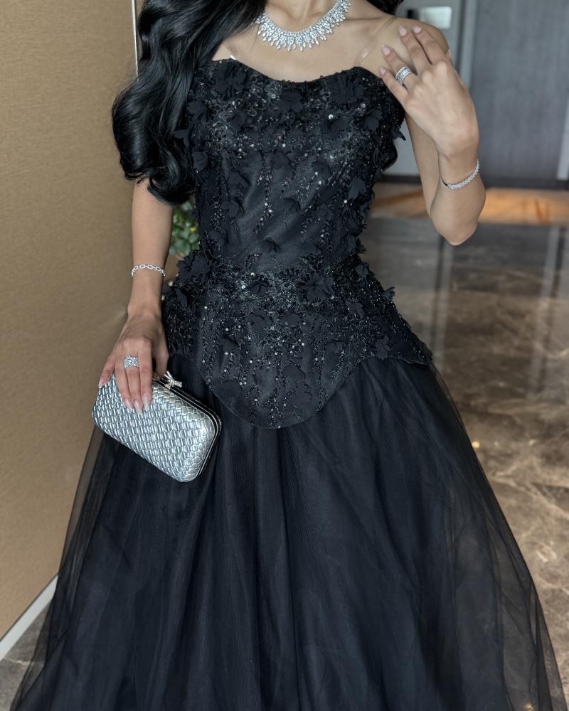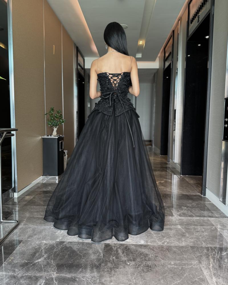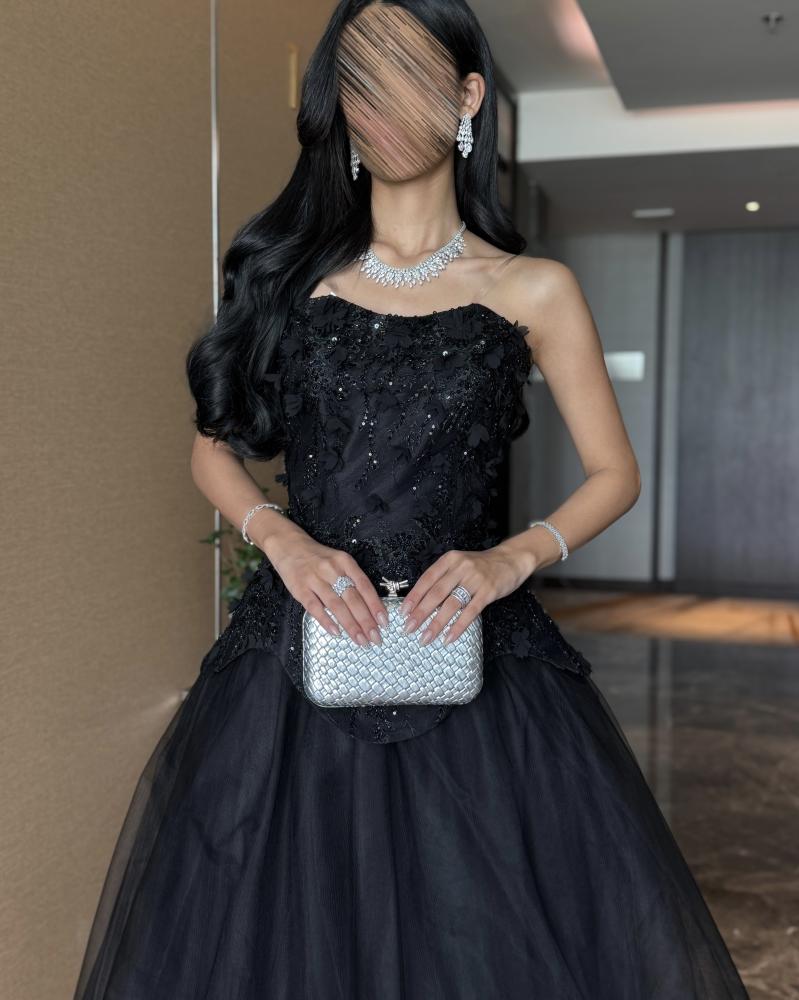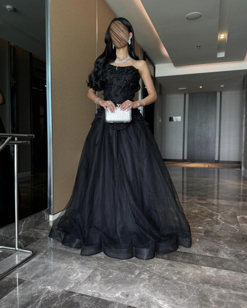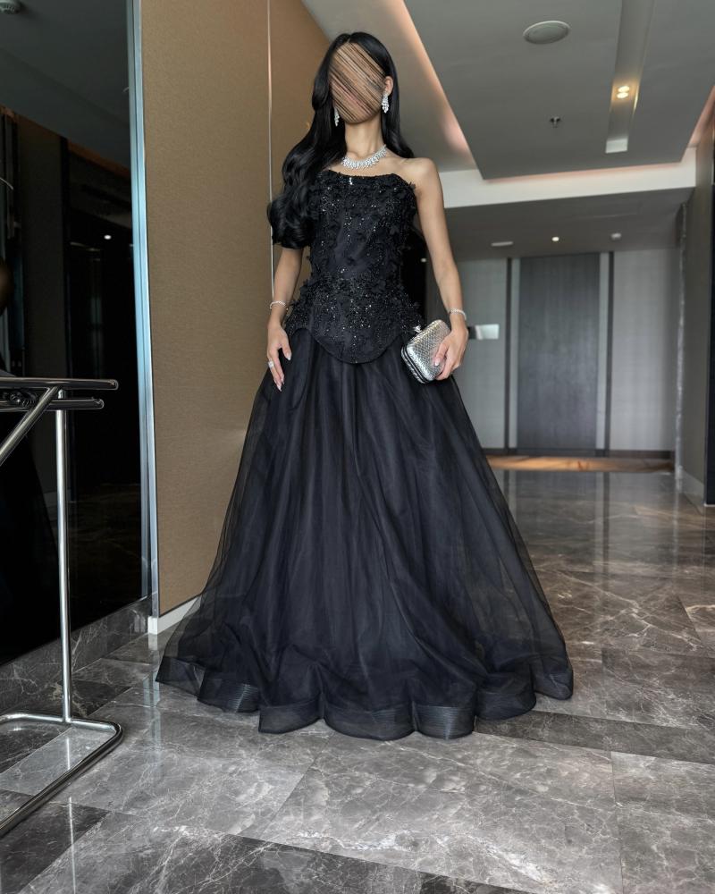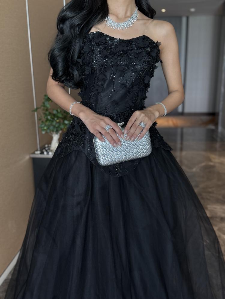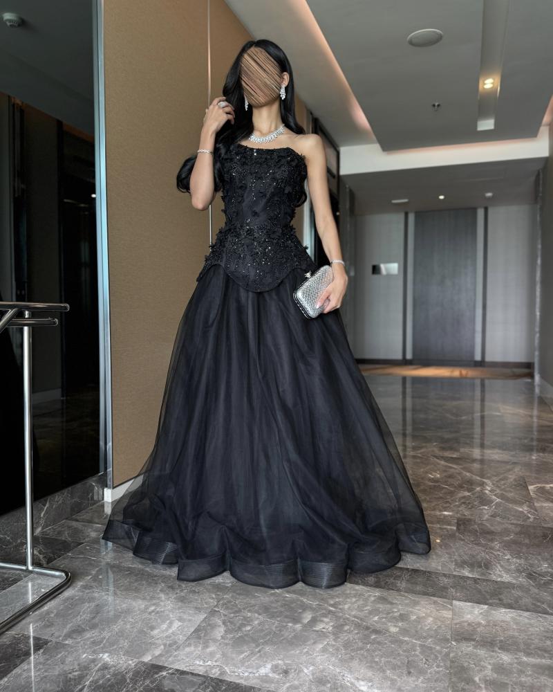 فستان سهرة طويل بلون اسود (Dusty Pink)، يجمع بين الرقة والأنوثة في تفاصيله الدقيقة