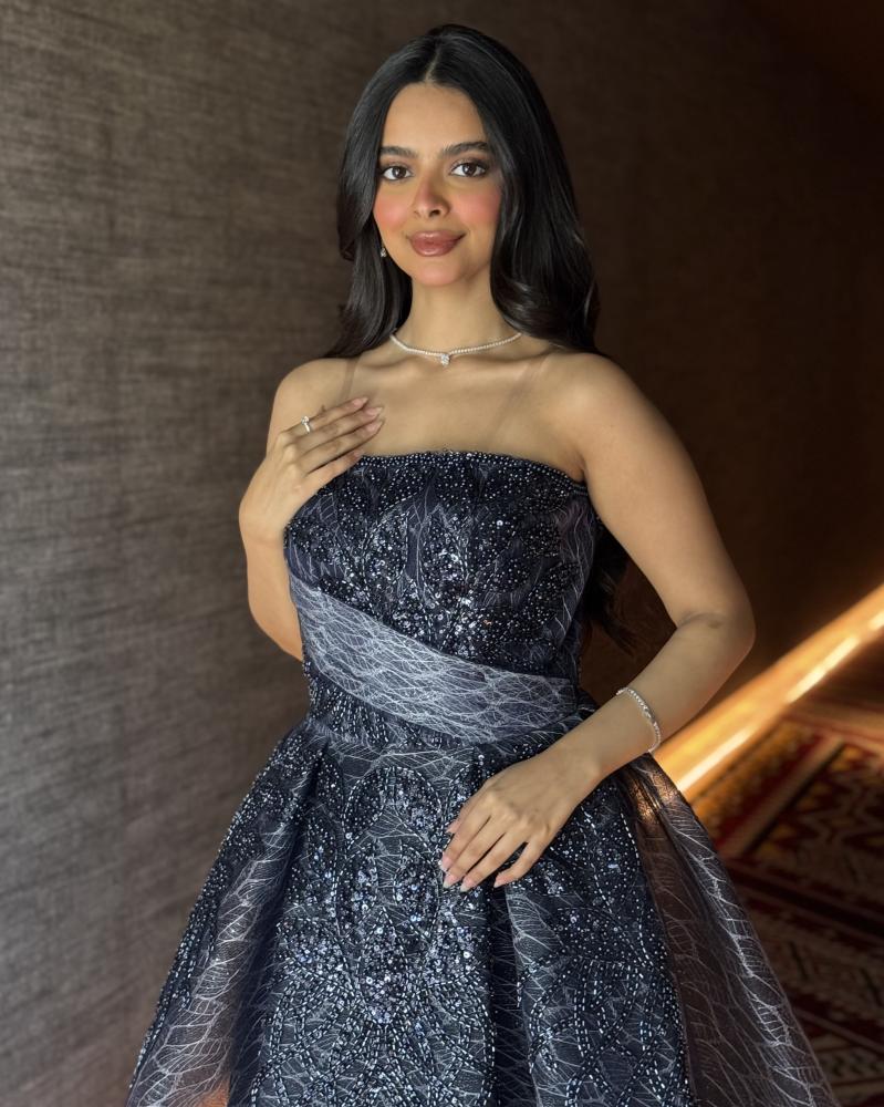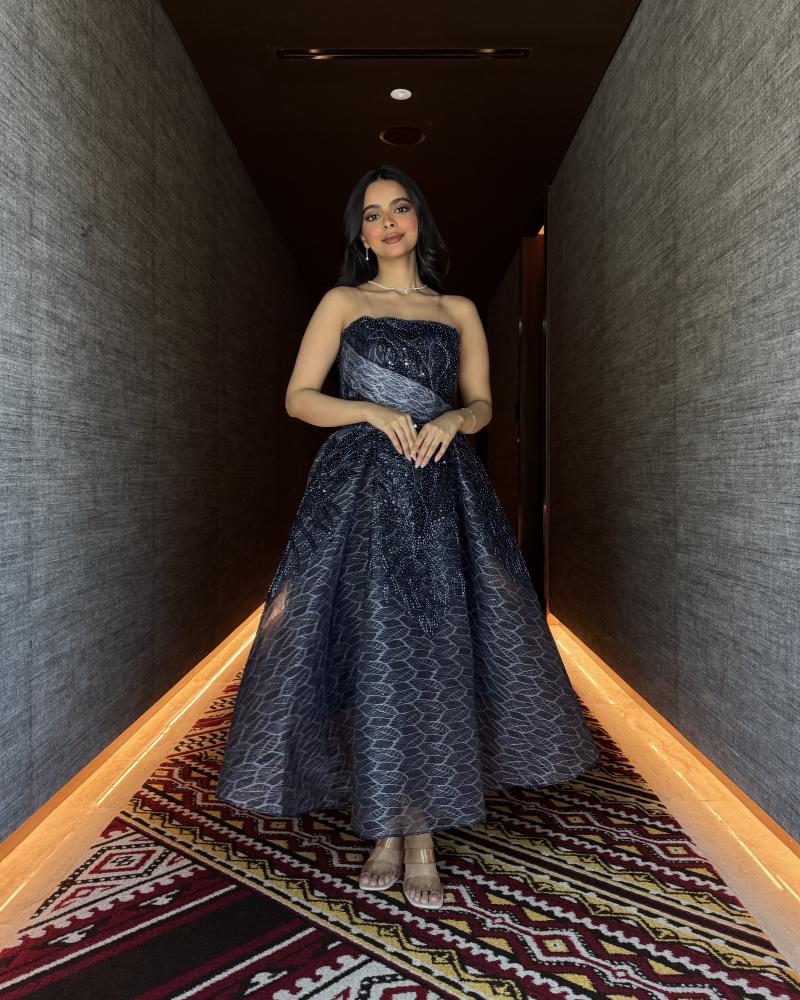 • اللون: كحلي فاتح، يمنح الفستان طابعاً ملكياً وفخامة.