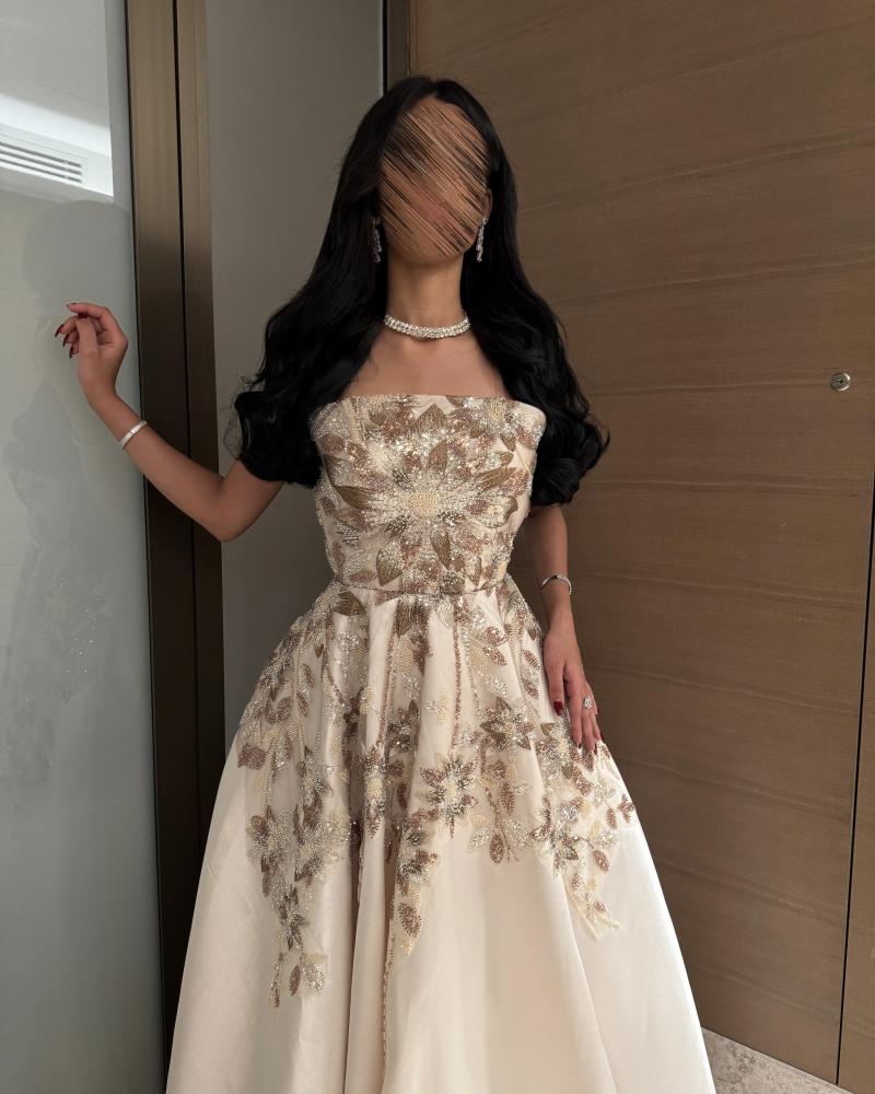 الجزء العلوي من الفستان بدون أكمام وبصدر مستقيم، مزين بتطريز فخم من الخيوط الذهبية والخرز اللامع على شكل زهور وأوراق متناثرة، مما يعطي مظهرًا متألقًا وفاخرًا.