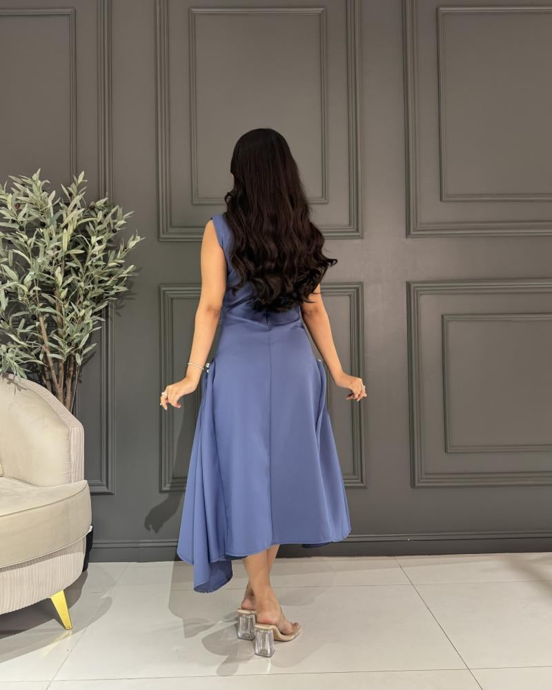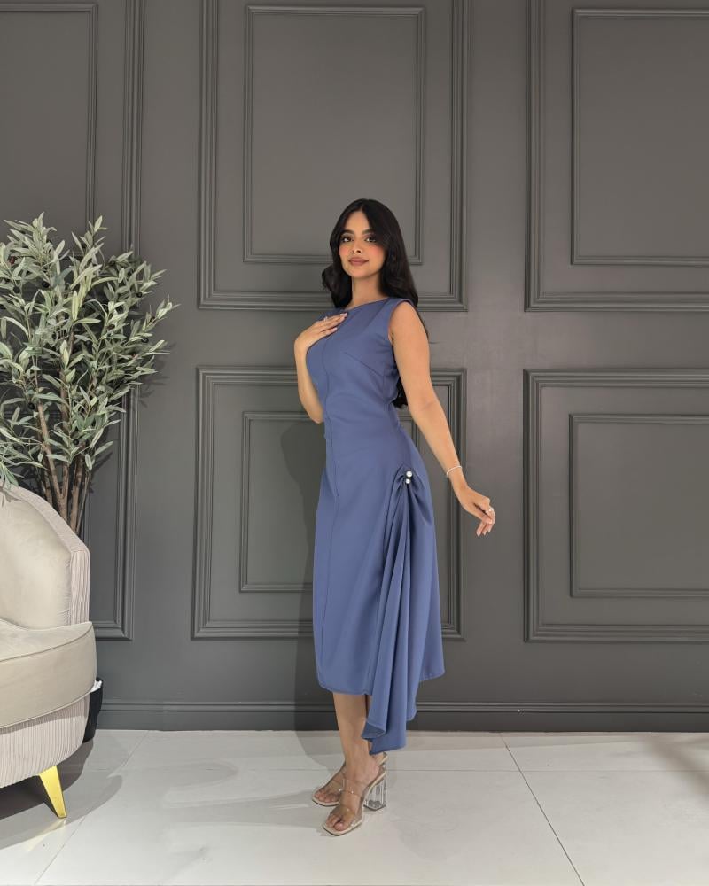 مواصفات الفستان:نوع الفستان : ناعم.نوع القماش : كريب باربي .• طريقة التفصيل : الفستان في الصورة يتميز بتصميم أنيق وعصري بلون أزرق داكن راقٍ، وهو خيار مثالي للمناسبات الرسمية وشبه الرسمية