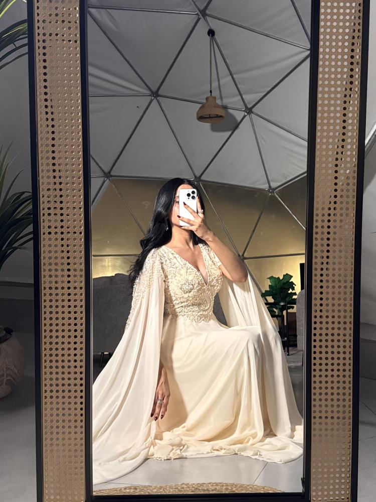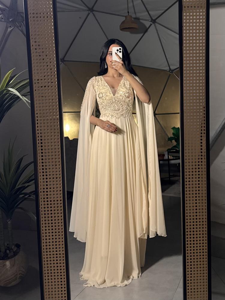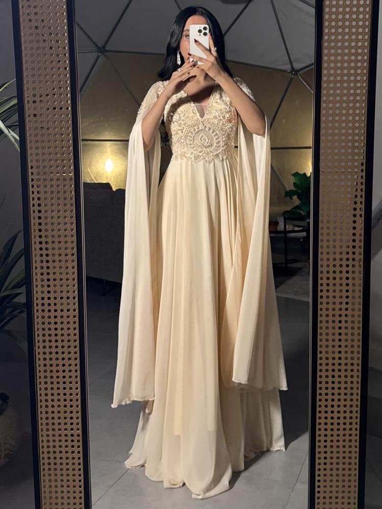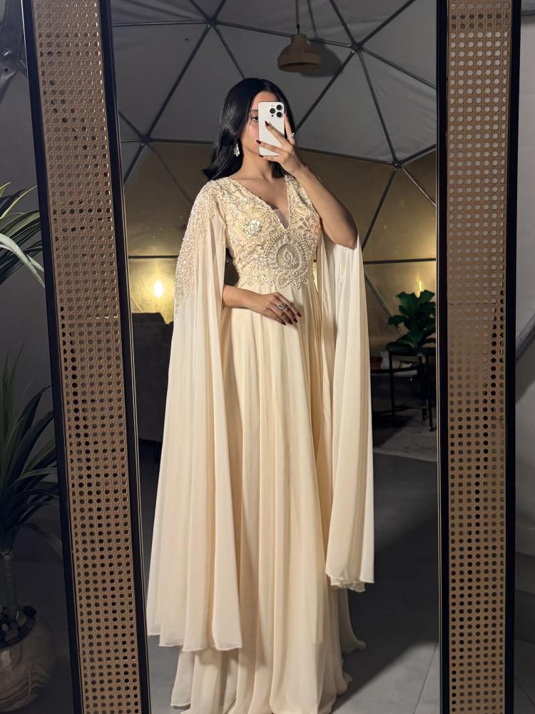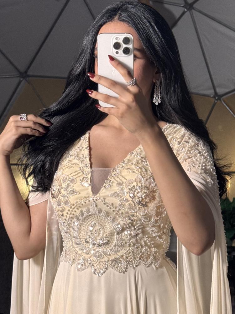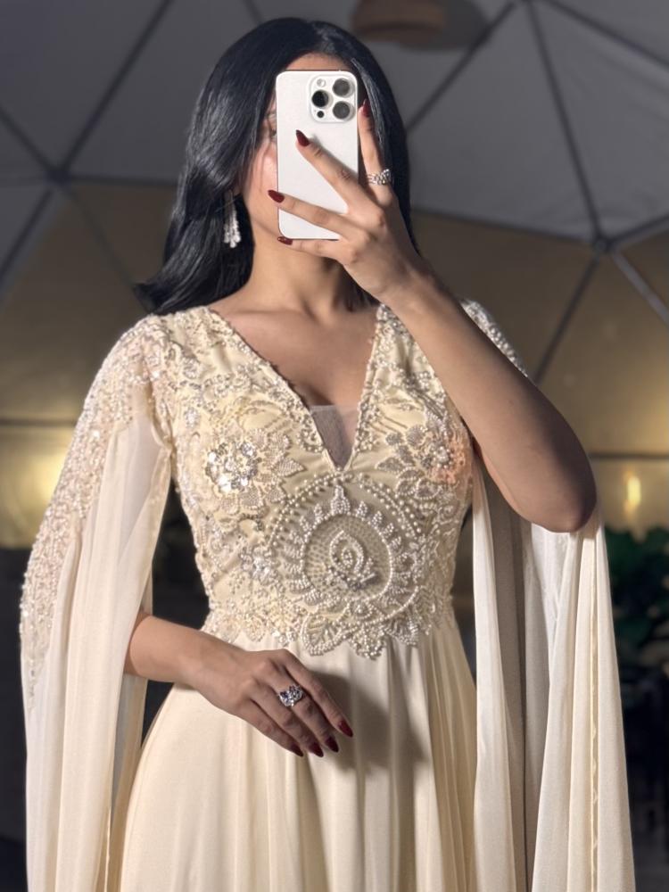 التفاصيل الإضافية: فستان أنيق بلون عاجي (off-white) أو بيج فاتح. يتميز بتصميم واسع وفضفاض من قماش خفيف ومنسدل، مما يضفي لمسة من الرقي والفخامة. الجزء العلوي من الفستان مزين بتطريزات دقيقة ولامعة تغطي الصدر والأكتاف وتستمر إلى الأكمام الطويلة التي تشبه الكاب (cape-style sleeves) ما يضيف مظهرًا ملكيًا وراقٍ.