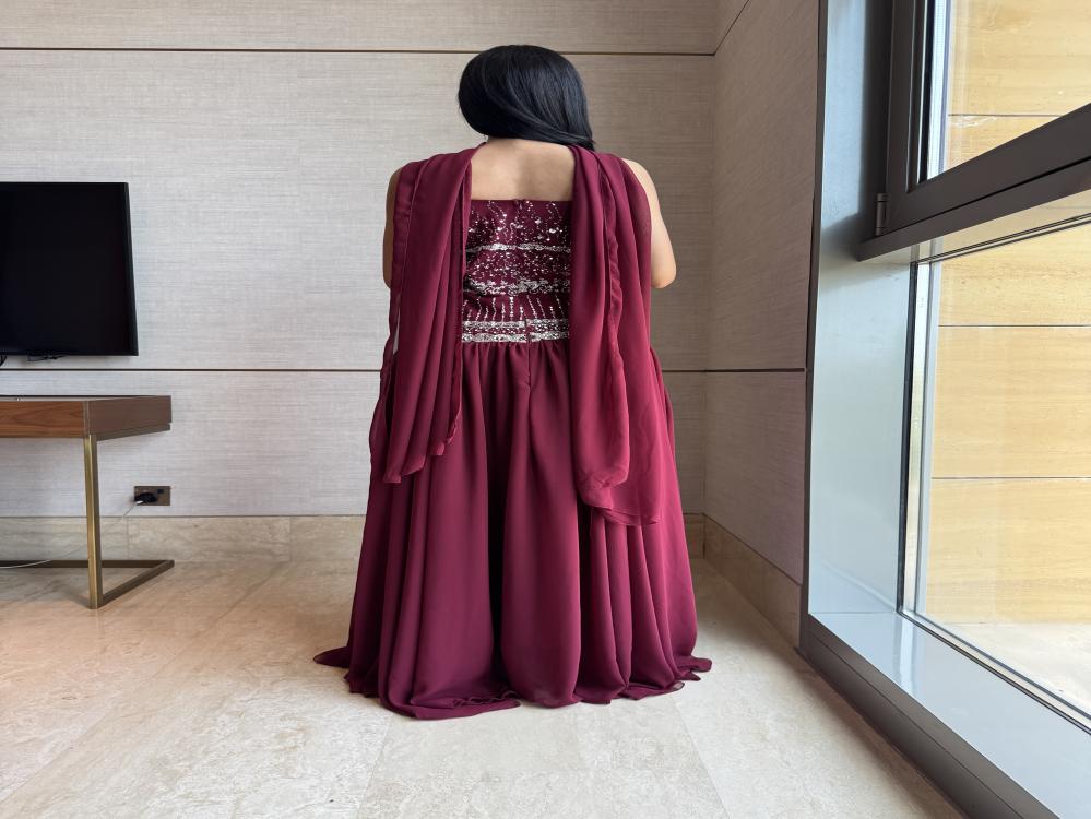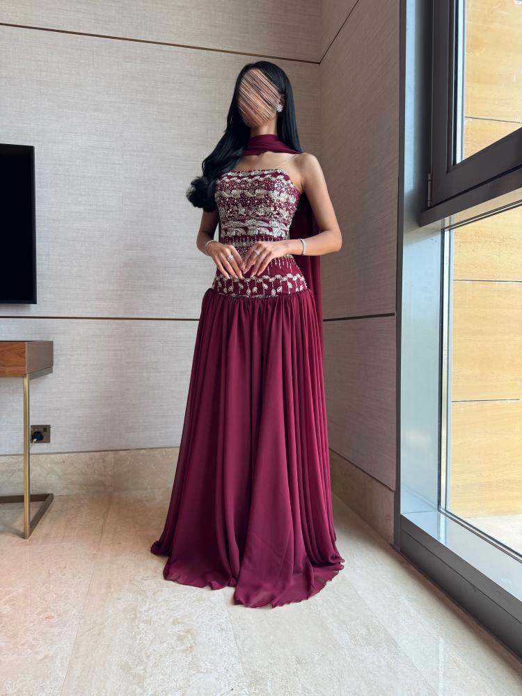 • الجزء السفلي: تنورة طويلة واسعة ومنسدلة ، ما يعطي الفستان انسيابية وأناقة عند الحركة