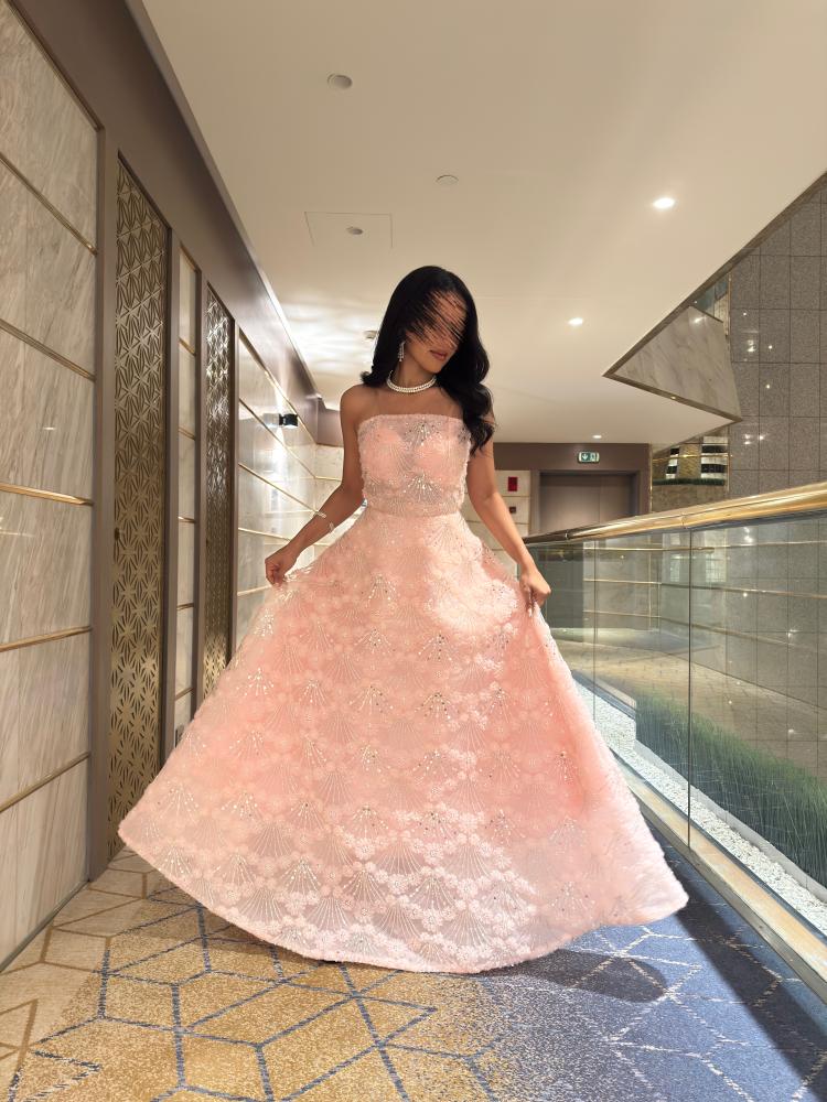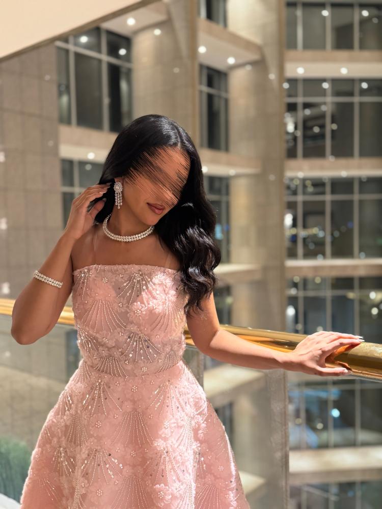 - اللون: وردي فاتح (blush pink)، يمنح الفستان طابعًا أنثويًا وناعمًا.
