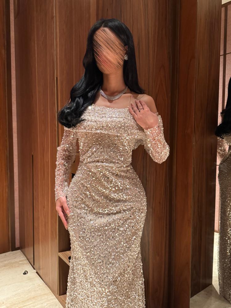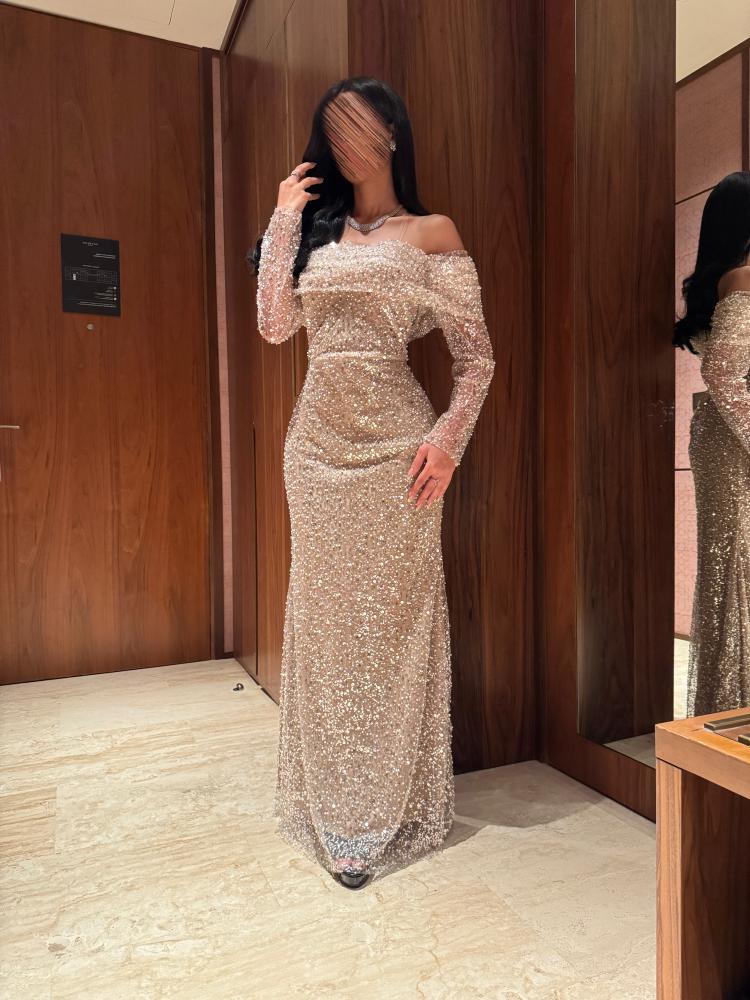 - الأكمام طويلة وشفافة قليلاً مع نفس تطريز الترتر.