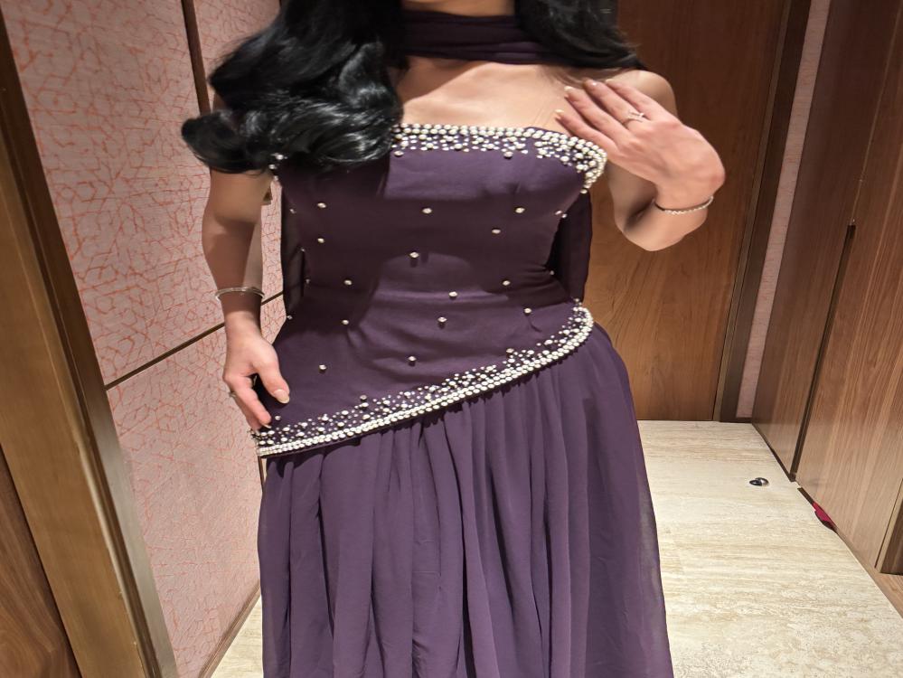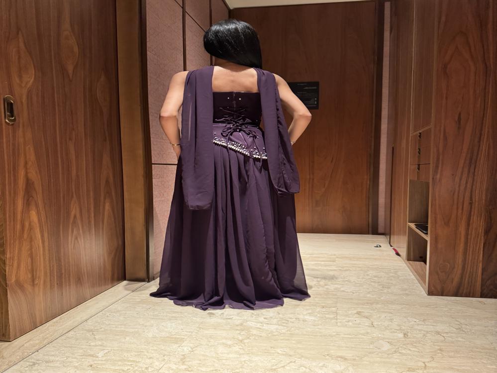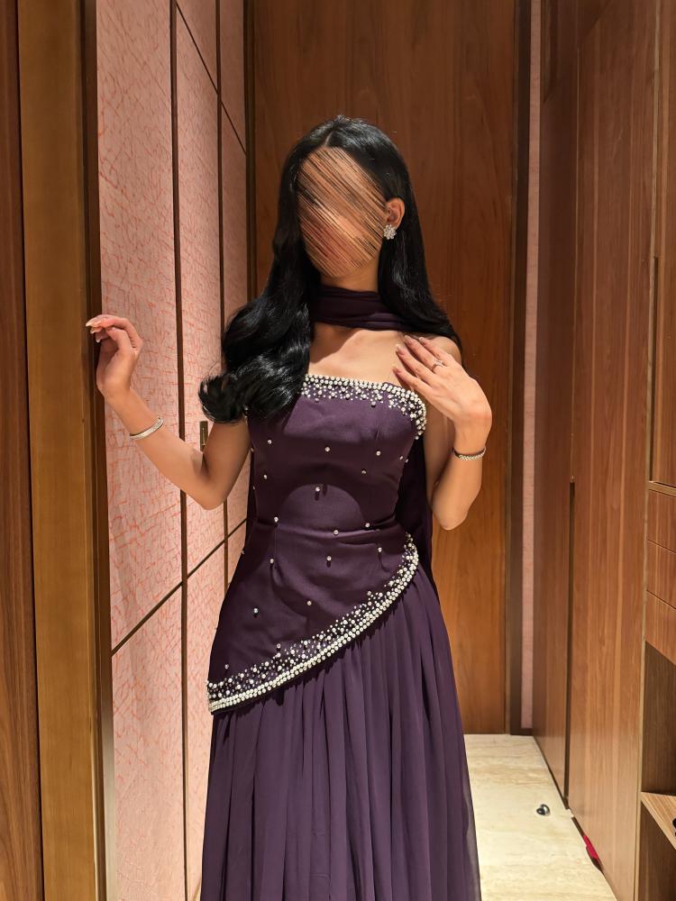 - الجزء السفلي: تنورة طويلة من قماش شيفون خفيف، تنسدل بانسيابية ناعمة حتى الأرض لتعطي الفستان حركة مرهفة وأنيقة