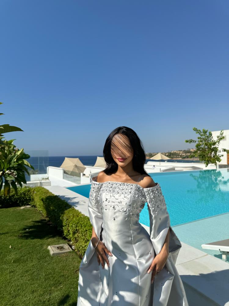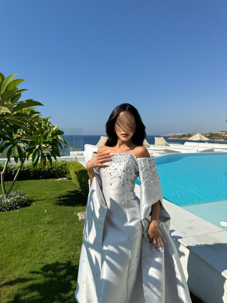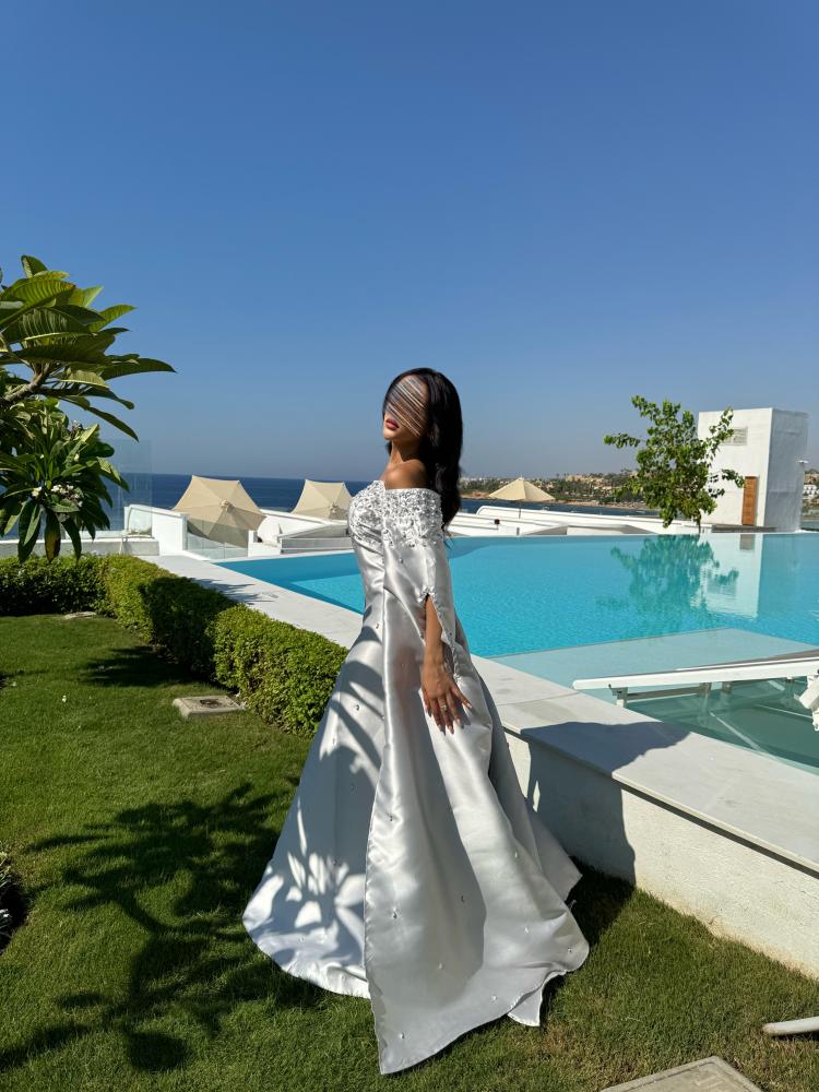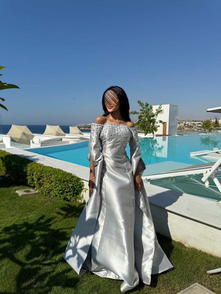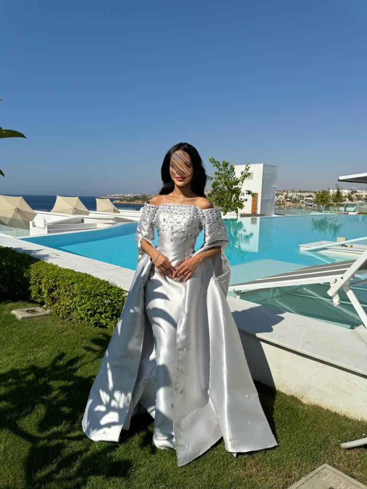 مواصفات الفستان:نوع الفستان : سهرة .نوع القماش : توب مياكدو .طريقة التفصيل :كرستال ولول كلفه الصدر أكمام حيران.التفاصيل الإضافية: فستان سهره انيق .