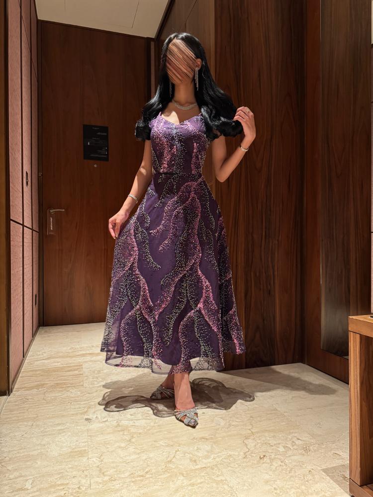 - الطقم: طويل متوسط الطول بلون بنفسجي داكن، مزين بتطريزات متلألئة باللون الوردي والفضي على شكل انسيابي يشبه الأمواج، مما يعطي لمسة فاخرة وراقية. تصميمه محدد عند الخصر ليبرز القوام، مع فتحة صدر على شكل قلب (Sweetheart neckline) تضفي أنوثة وجاذبية.