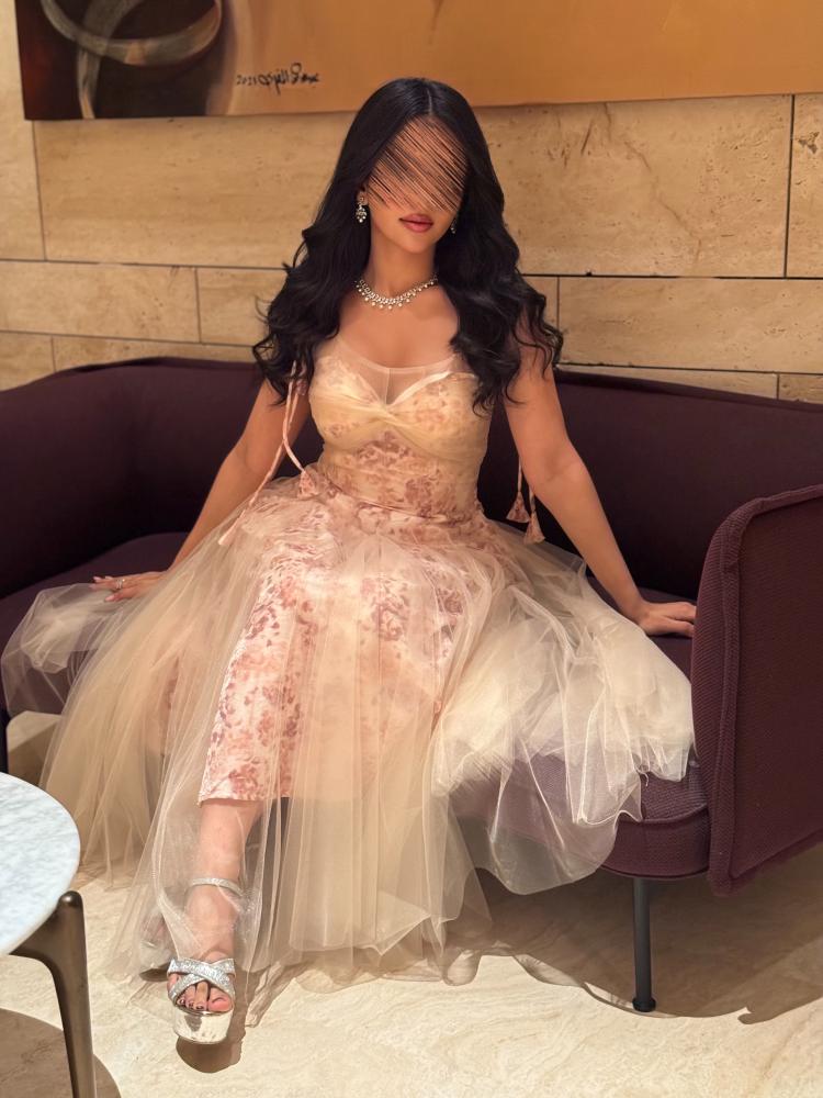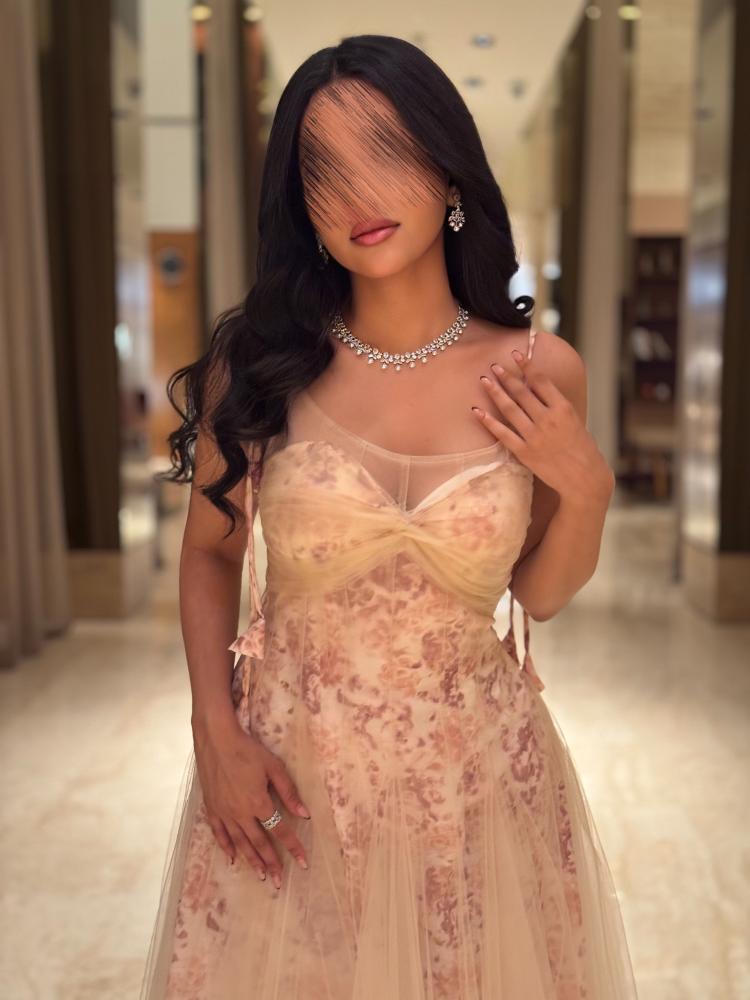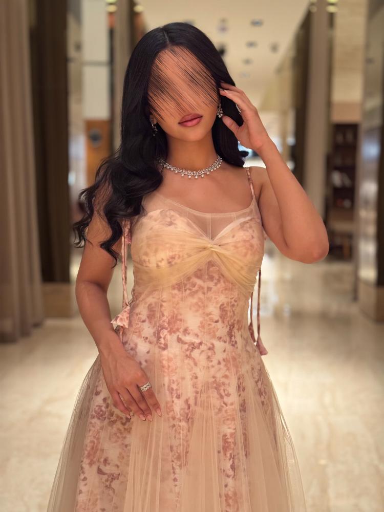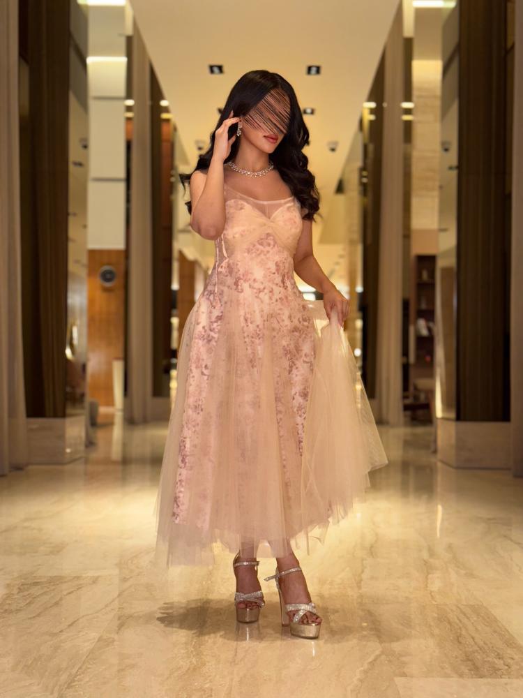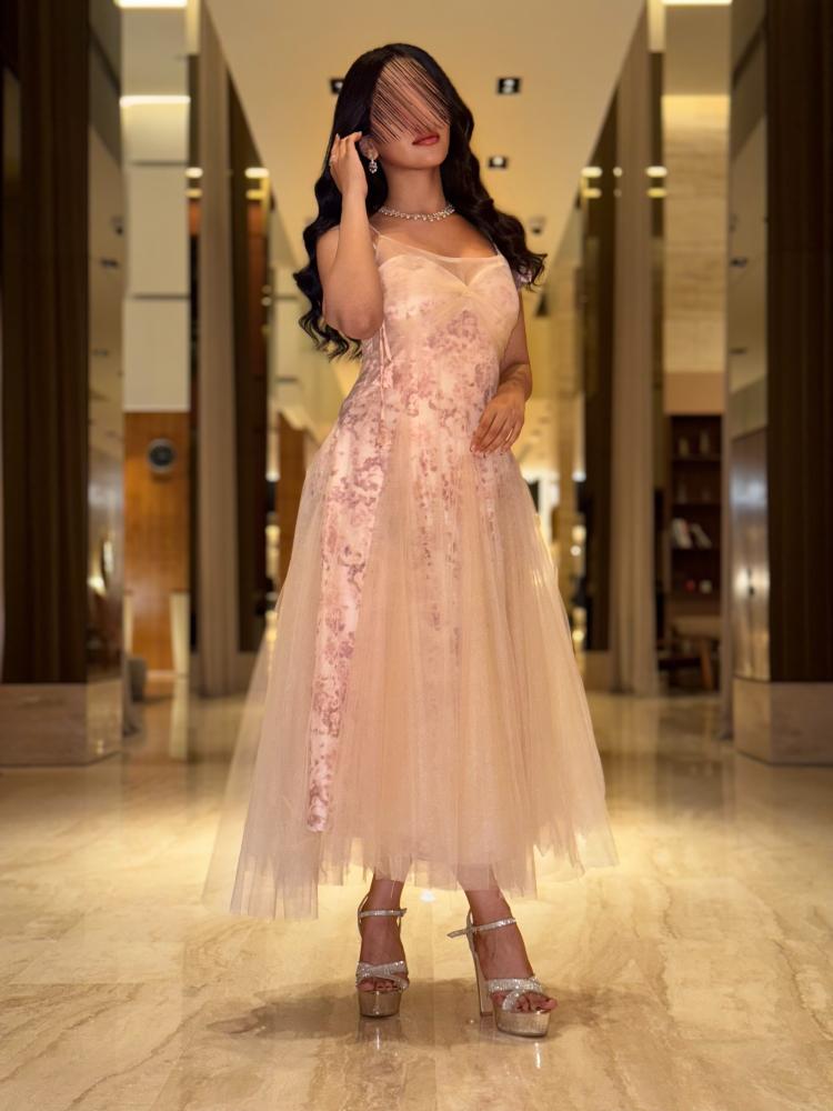 • تفاصيل اضافية : الفستان أنثوي ورقيق بتصميم ناعم باللون الوردي الفاتح. يتميز بقصة ميدي (متوسطة الطول) مع تنورة واسعة مصنوعة من التول الخفيف، مما يمنحه لمسة حالمة وانسيابية. الجزء العلوي مصنوع من قماش حريري مع تفاصيل شفافة عند الأكتاف وصدرية على شكل قلب، ما يضفي لمسة رومانسية. كما يحتوي على نقوش زهرية خفيفة تضيف لمسة من الأناقة والأنوثة. الفستان مثالي للمناسبات الراقية، مثل الحفلات والسهرات