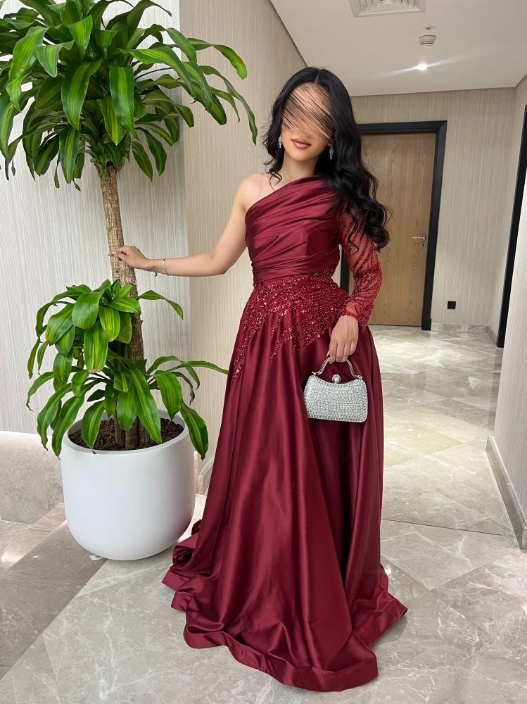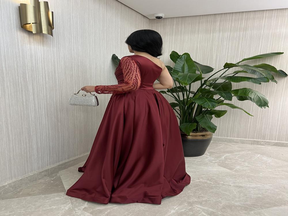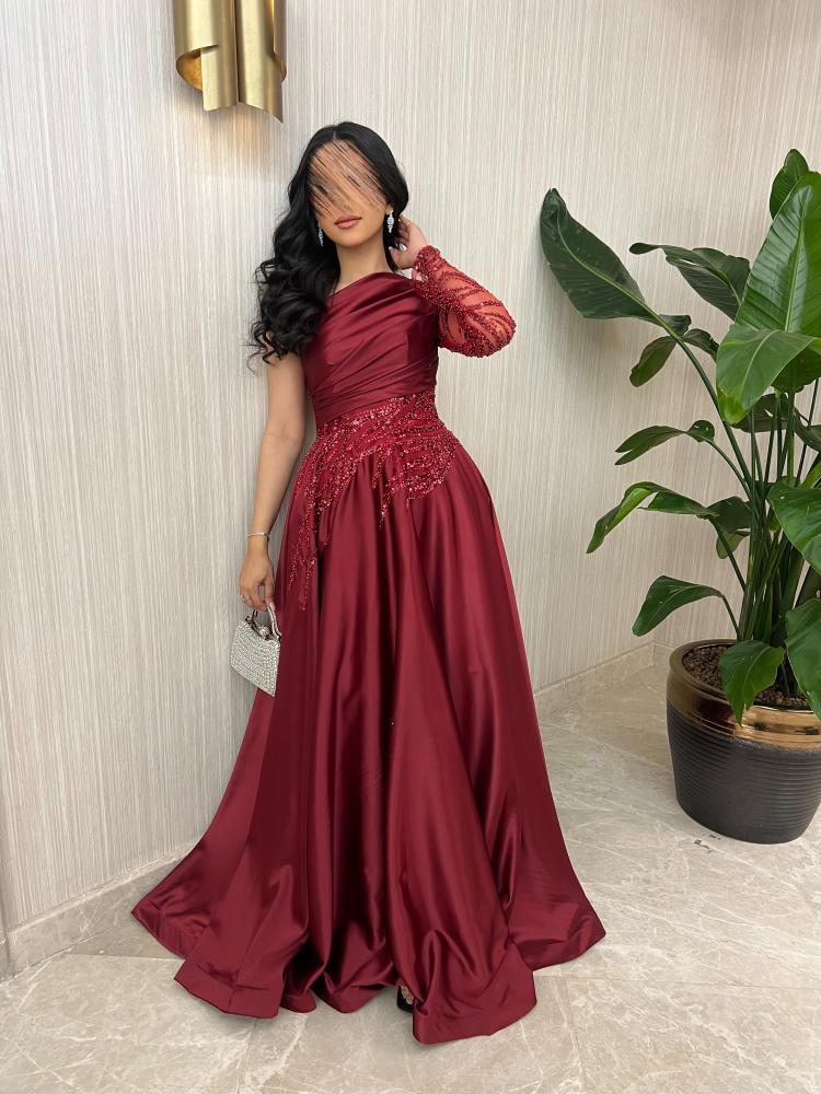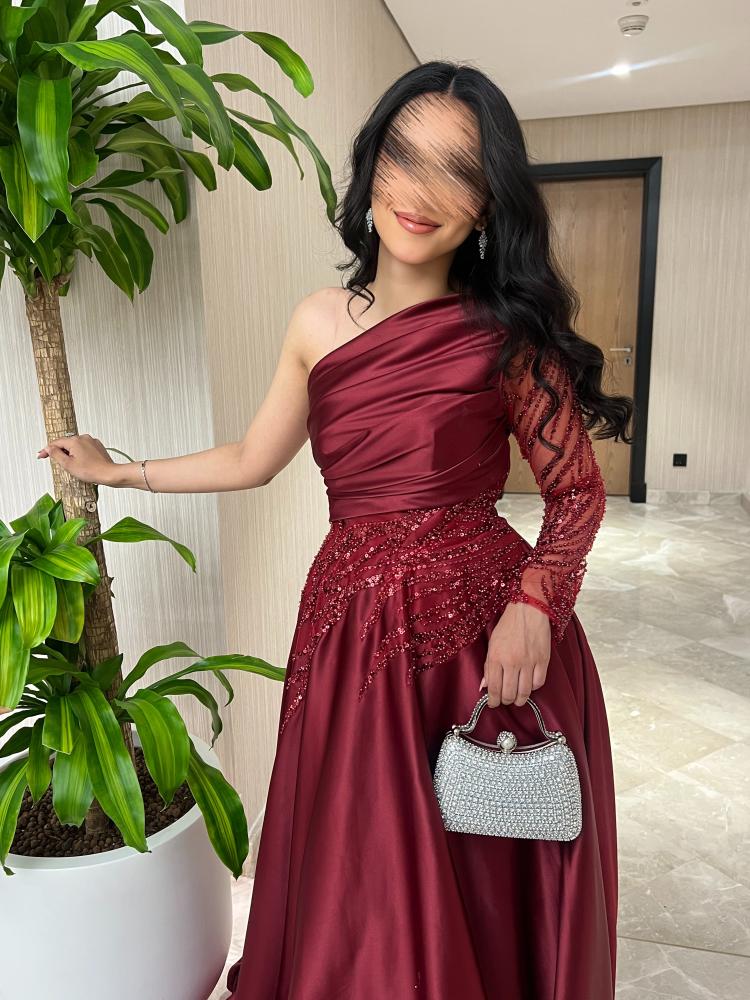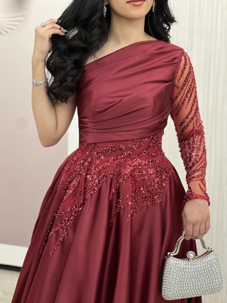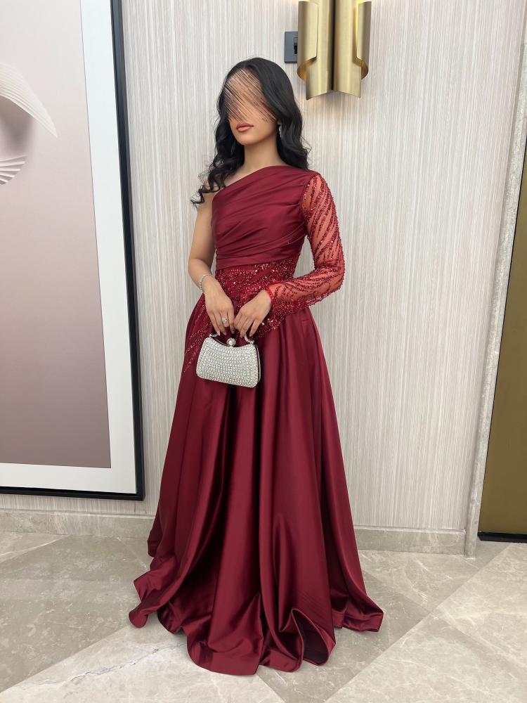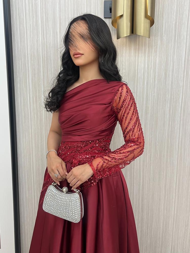مواصفات الفستان:نوع الفستان : سهرة .نوع القماش : تفتة استرتش .طريقة التفصيل : كم مطرز مع الخصر كلفة الشعاع . التفاصيل الإضافية: فستان سهره انيق .