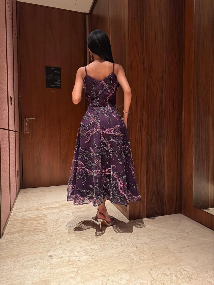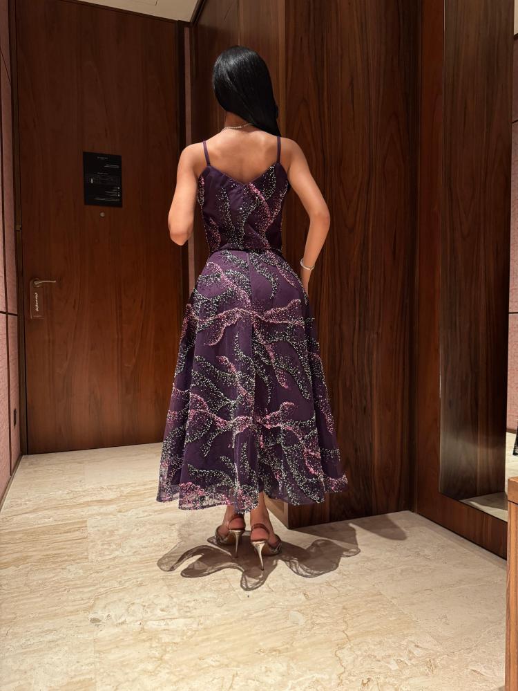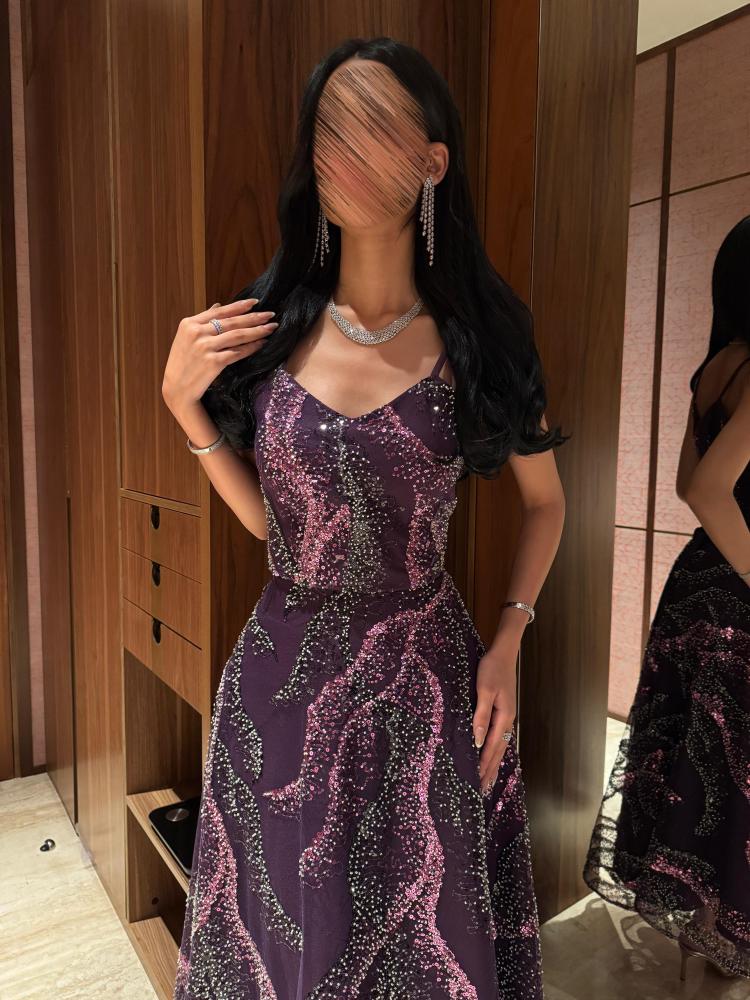 - الطقم: طويل متوسط الطول بلون بنفسجي داكن، مزين بتطريزات متلألئة باللون الوردي والفضي على شكل انسيابي يشبه الأمواج، مما يعطي لمسة فاخرة وراقية. تصميمه محدد عند الخصر ليبرز القوام، مع فتحة صدر على شكل قلب (Sweetheart neckline) تضفي أنوثة وجاذبية.