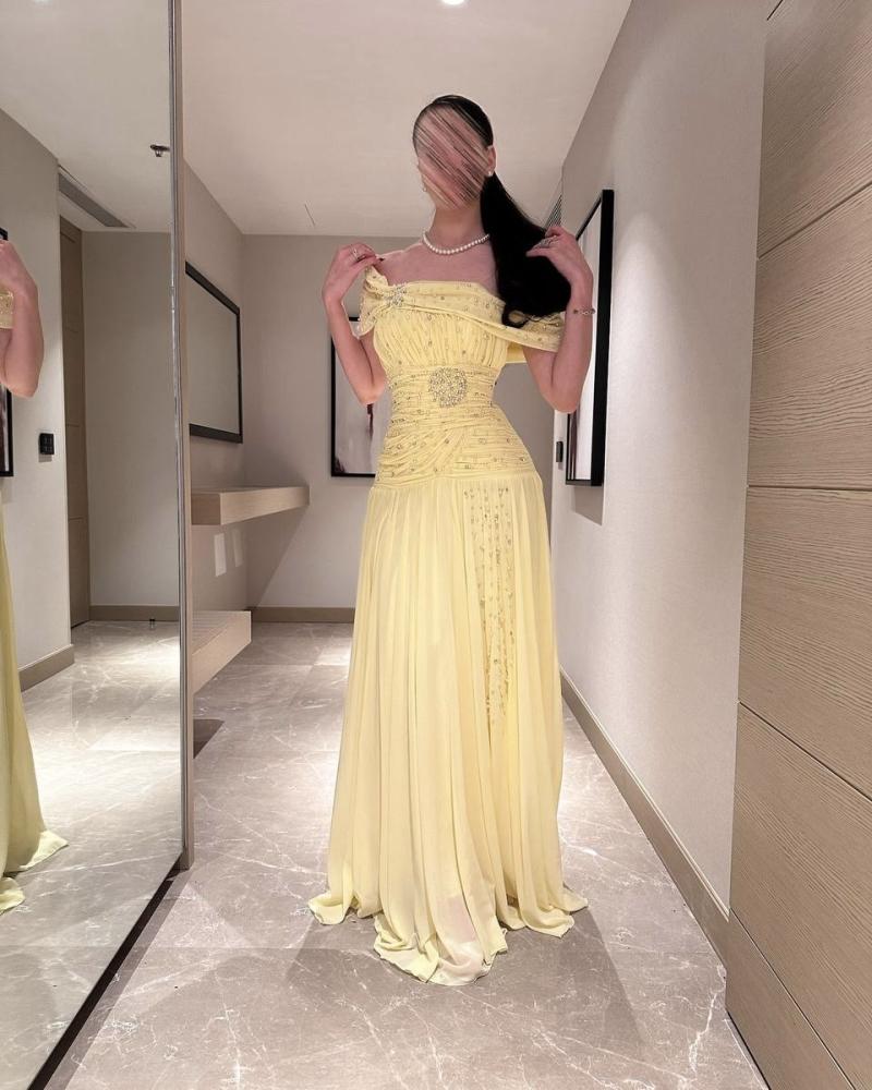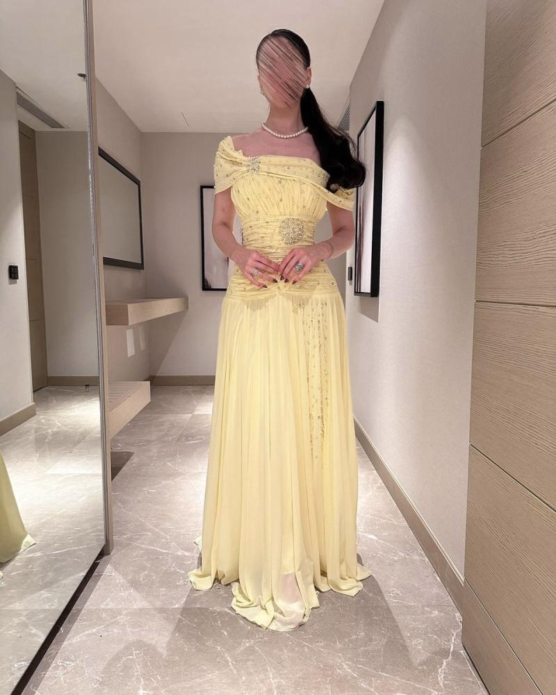 الفستان بلون اصفر فاتح ، مصنوع من قماش شيفون حريري يمنحه خفّة وانسيابية رائعة. الجزء العلوي بتصميم أوف شولدر (off-shoulder) مع تطريز لؤلؤي وخرز فضي صغير متناثر بشكل متناغم، يضيف لمسة من اللمعان والرقي.