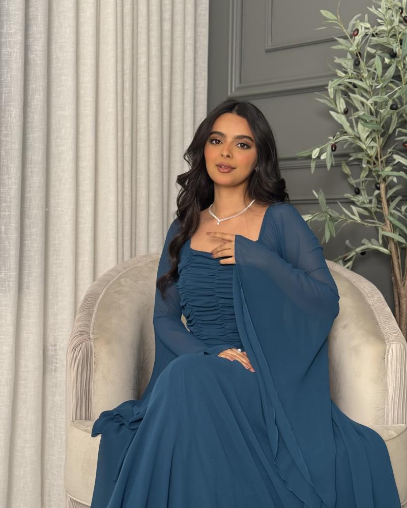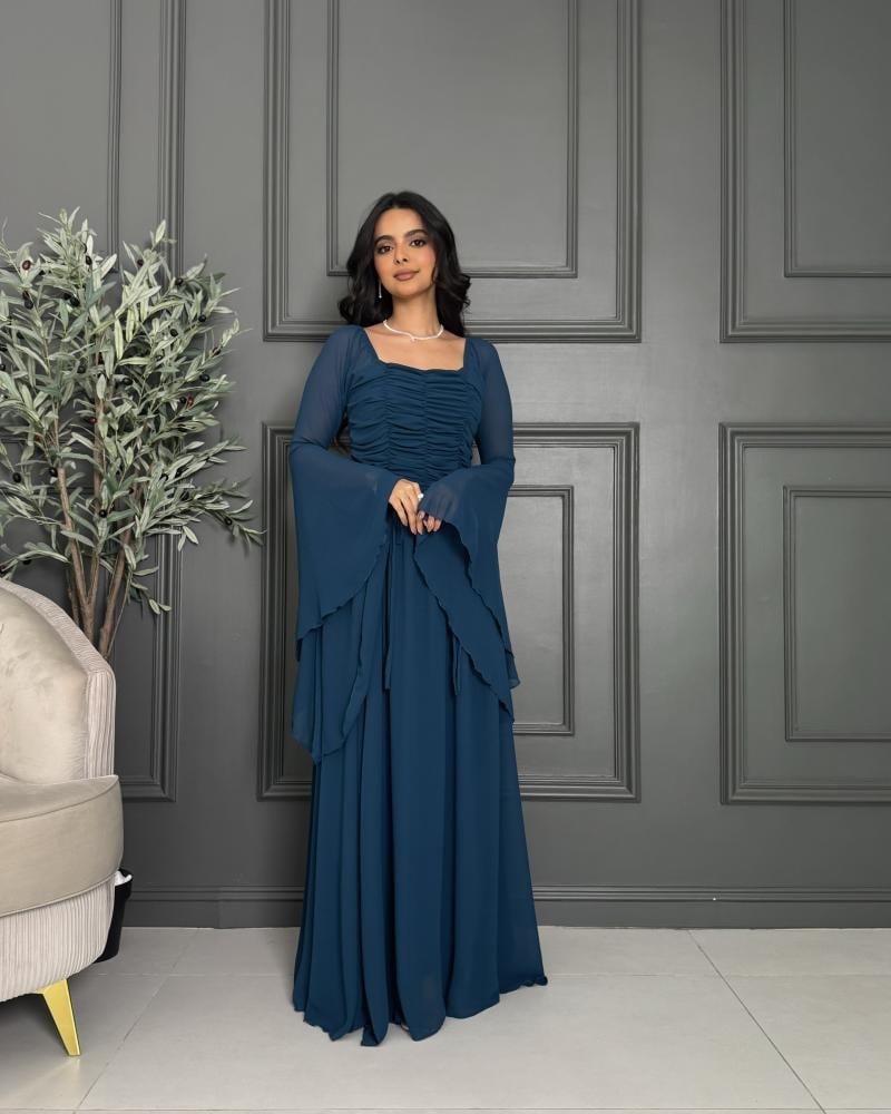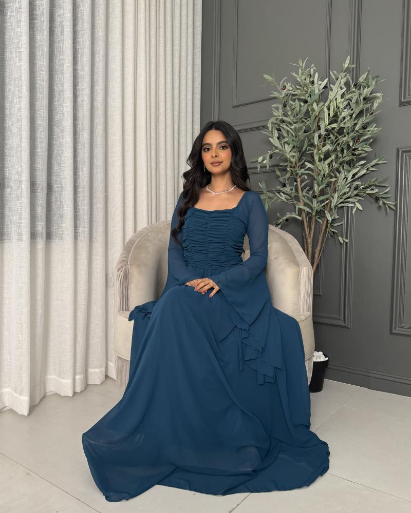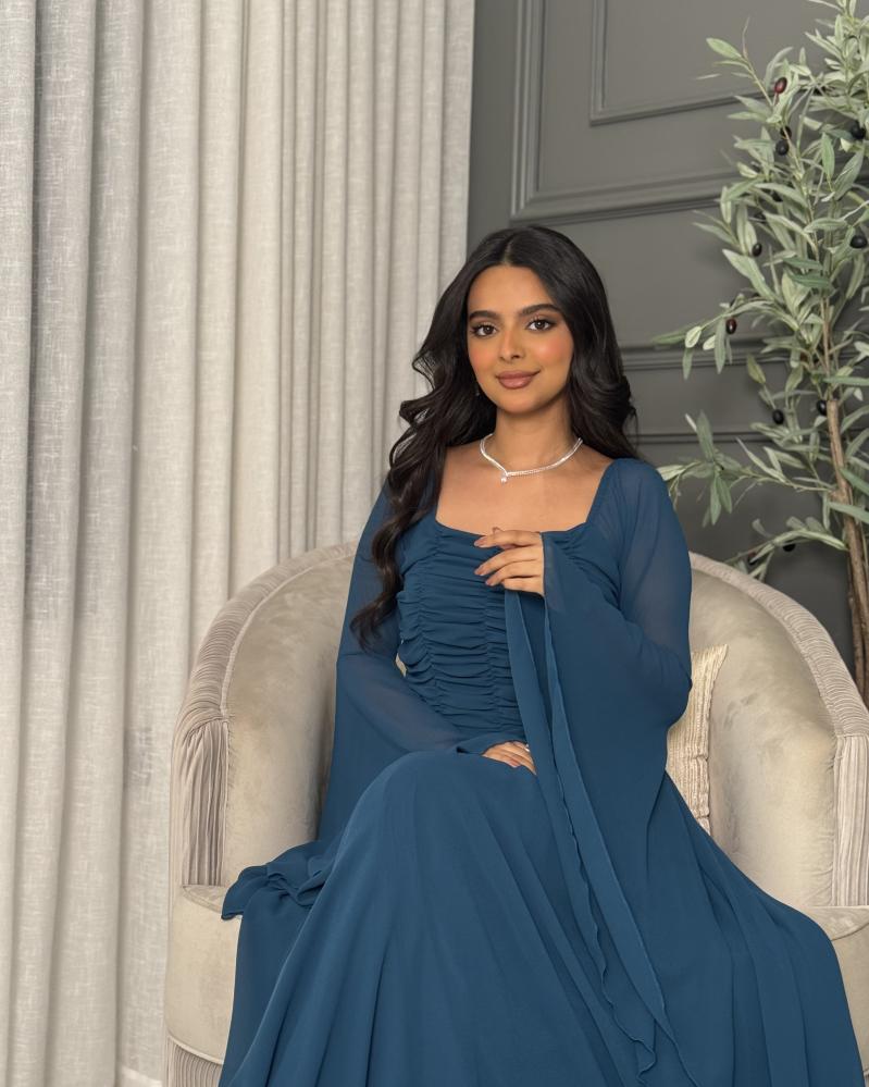 مواصفات الفستان:نوع الفستان : ناعم .• نوع القماش : شيفون. • تفاصيل اضافية : القماش مصنوع من الشيفون • الطول : ٦٠ انش من الكتف