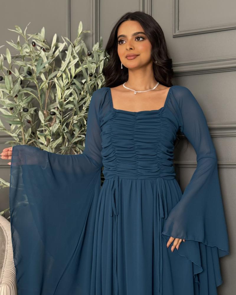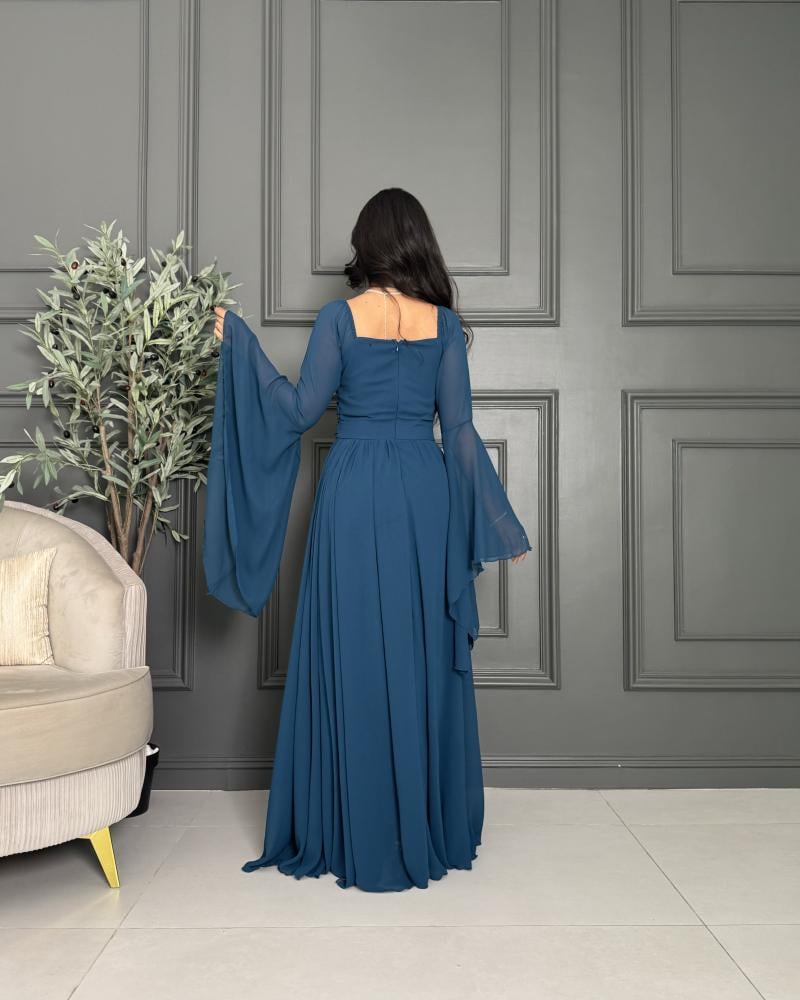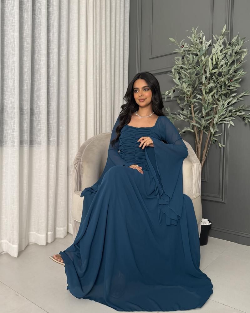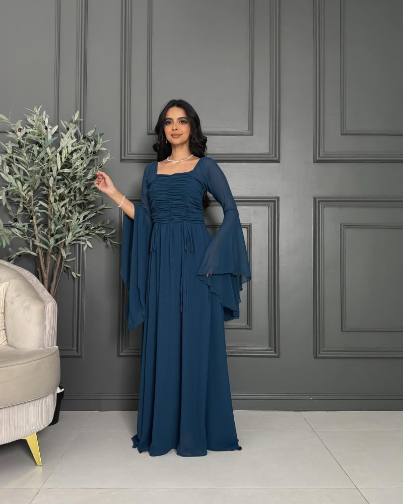 مواصفات الفستان:نوع الفستان : ناعم .• نوع القماش : شيفون. • تفاصيل اضافية : القماش مصنوع من الشيفون • الطول : ٦٠ انش من الكتف